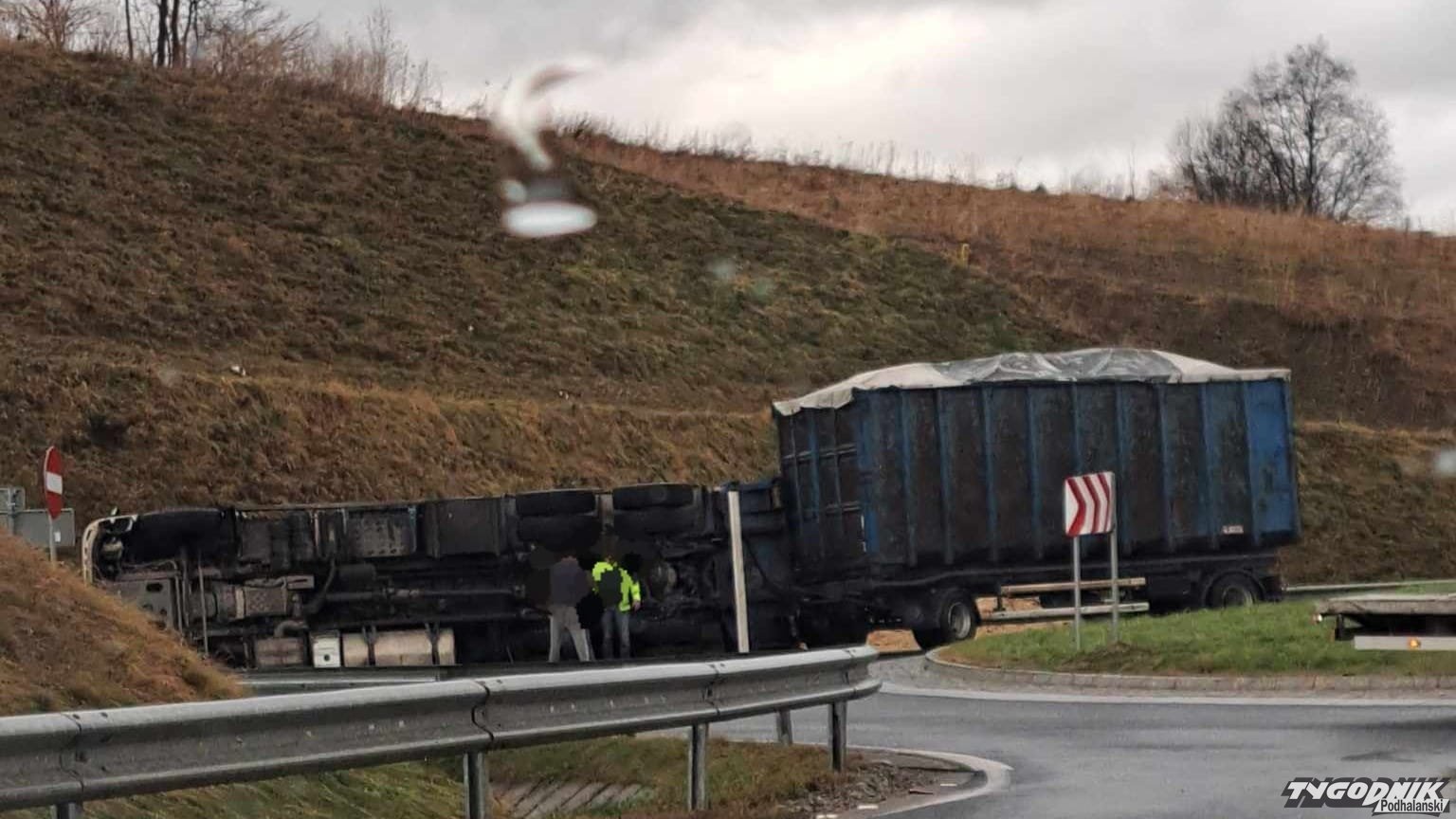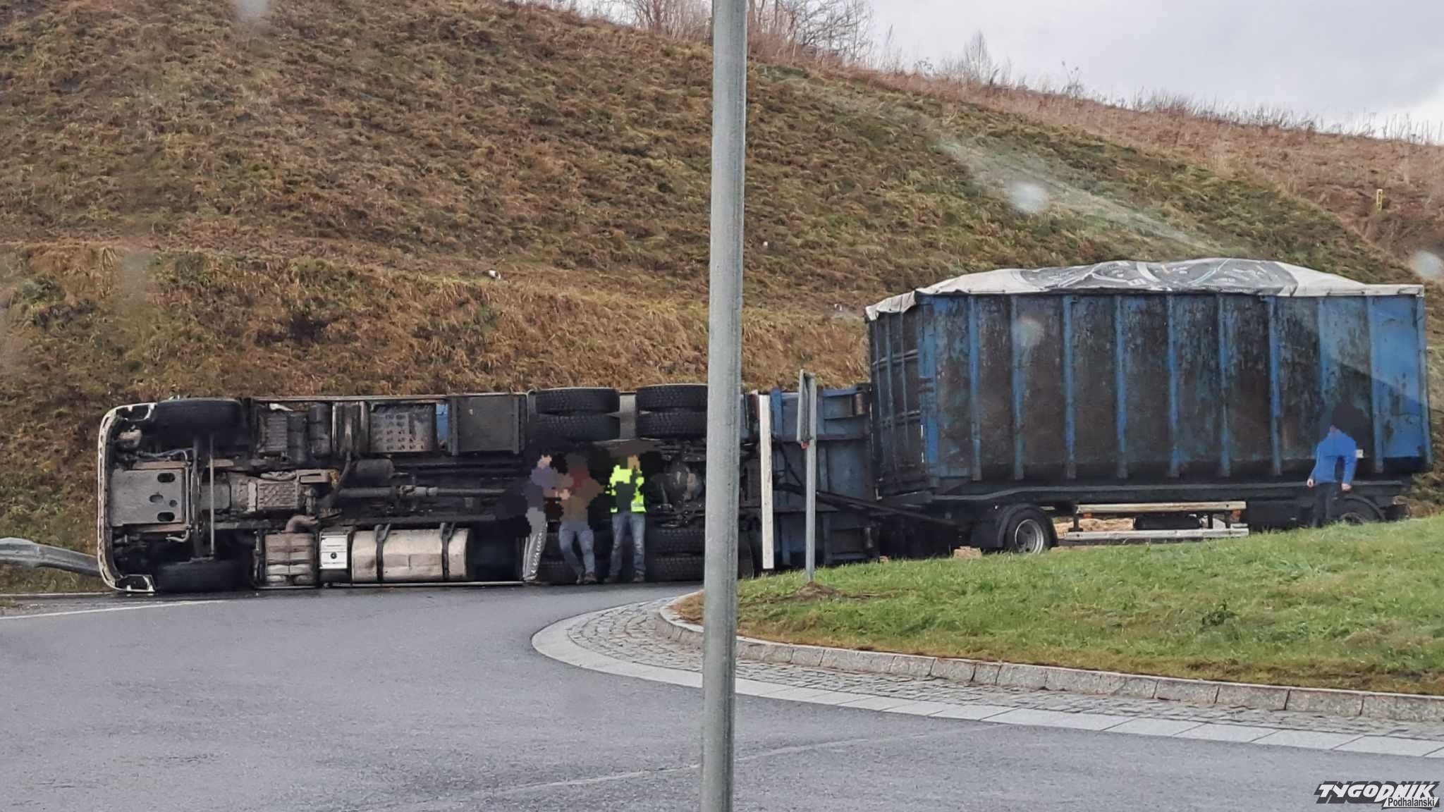Ciężarówka przewróciła się na rondzie w Skomielnej Białej