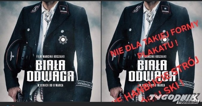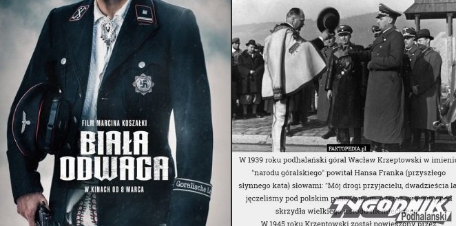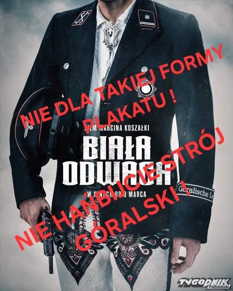"Szanowni Państwo. Mój post dotyczy filmu: Biała Odwaga. Wielu Góroli Podhalańskich poczuło się osobiście dotkniętych urażonych przede wszystkim PLAKATEM który reklamuje ten film. Film ten w bardzo złym świetle przedstawia Górali Podhalańskich. Wielu Górali walczyło z Niemcami w Kampanii wrześniowej 1939 rok. I na różnych frontach 2 Wojny Światowej. Na Naszej Grupie są różne zdjęcia Bohaterów Podhala. oczywiście NIE wszystkich przede wszystkim mowa jest o Kurierach Tatrzańskich którym to dedykowany Jest Pomnik w Zakopiańskich Kużnicach. Proszę pamiętać iż Nikt NIE ma prawa składać Hołdu gdziekolwiek i kiedykolwiek w imieniu całej społeczności Góralskiej" - czytamy we wpisie Zbyszka Mrowcy. Ilustruje swój wpis zestawiając filmowy plakat ze zdjęciem przedstawiającym powitanie przez górala Wacława Krzeptowskiego w imieniu "narodu góralskiego" Hansa Franka.