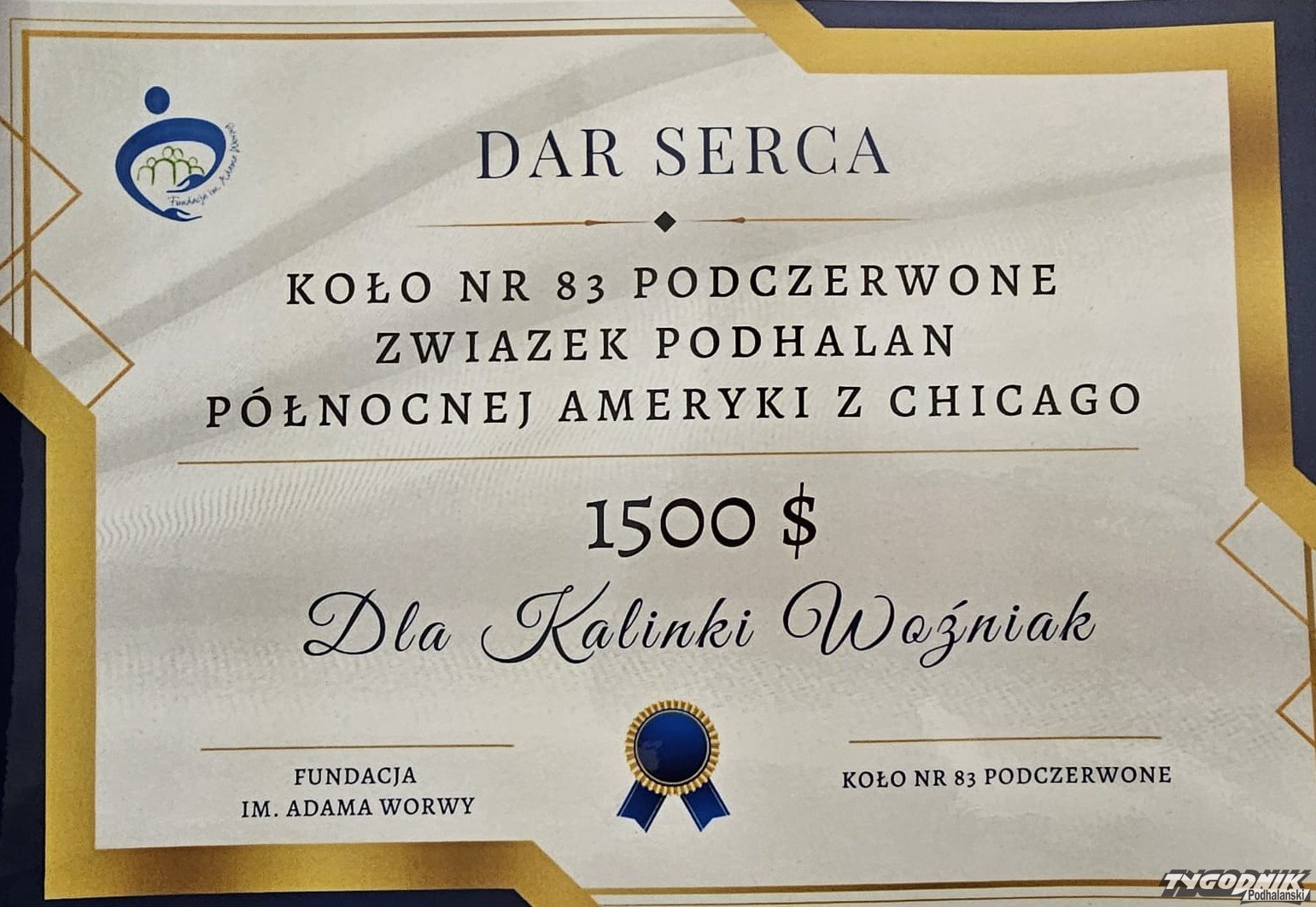 Dziś do nowotarskiej siedziby Fundacji im. A. Worwy dotarły pieniądze zebrane przez górali z Koła nr 83 Podczerwone ZPPA w Chicago podczas niedawnego "Opłatka".