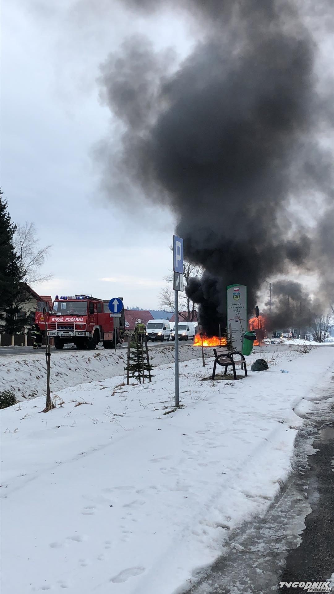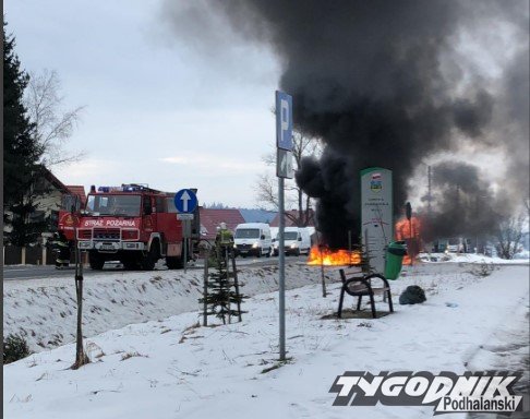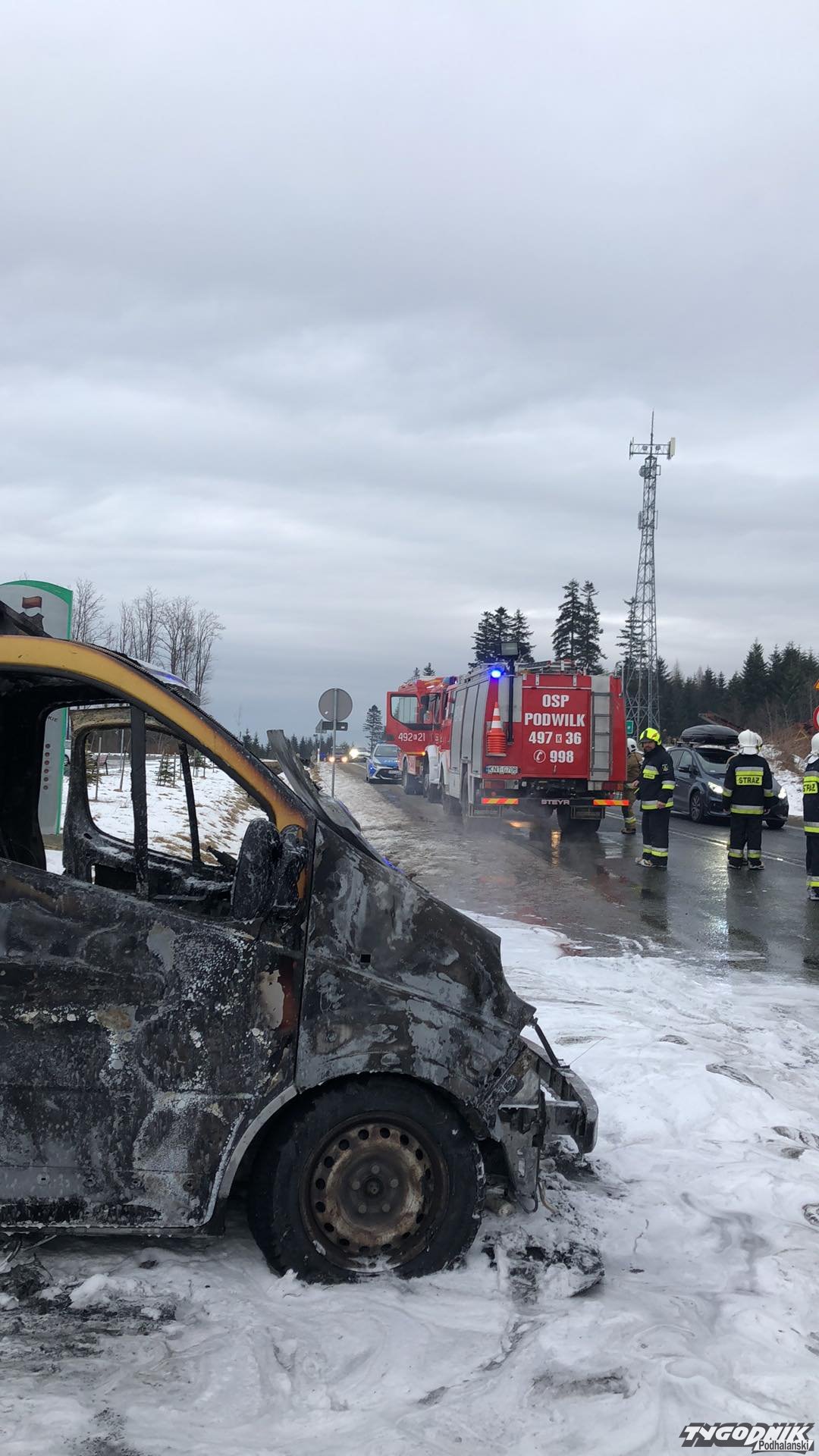Samochód dostawczy jest całkowicie objęty pożarem. Na miejsce dojeżdżają jednostki strażackie z Podwilka, Spytkowic a także strażacy z rabczańskiej jednostki Ratowniczo Gaśniczej. Pożar został szybko ugaszony.