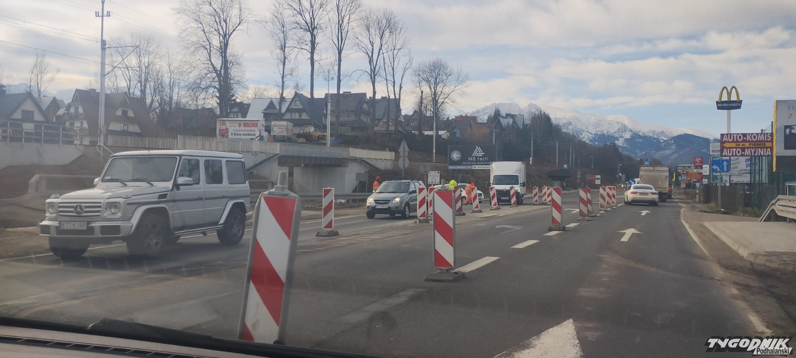 Na drodze wjazdowej do Zakopanego ustawione biało-czerwone drogowe pachołki. Lewoskręt w stronę Olczy wyłączony został częściowo z ruchu, prowadzone są prace drogowe. Noga z gazu, zachowajmy w tym miejscu szczególną ostrożność.