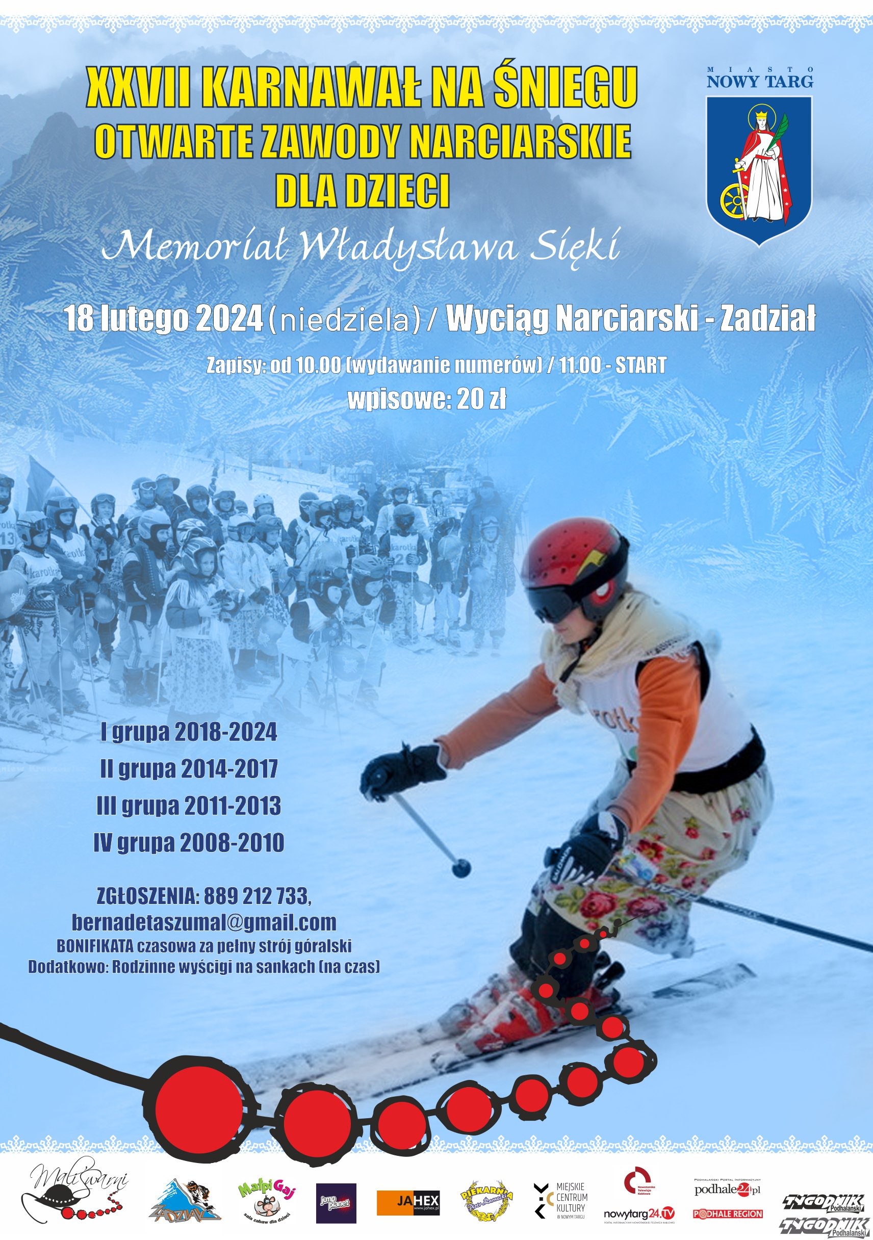 Dziecięcy Zespół Góralski "Mali Śwarni" zaprasza w niedzielę 18.02 na Otwarte Zawody Narciarskie dla dzieci "Karnawału na śniegu" - Memoriał Władysława Sięki.
