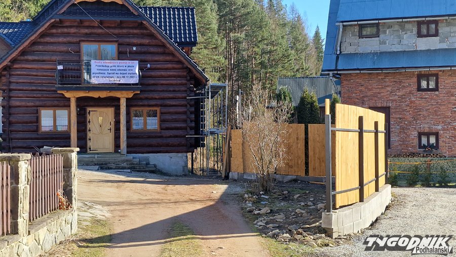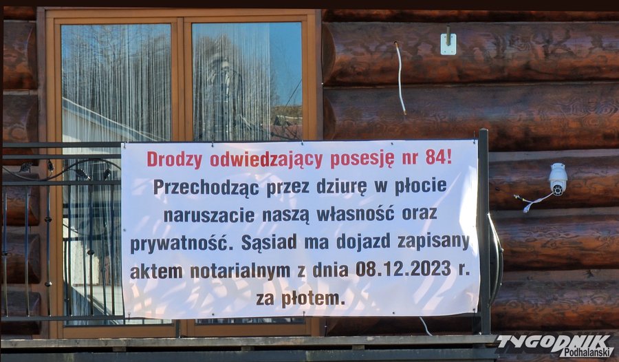 Dziś sytuacja jest patowa. Kubiczowie nie mają jak dojechać do domu, mają też kłopot z wejściem do domu. By to mogło być możliwe musieli w płocie wyrwać jedną z płyt i tą dziurą w płocie wchodzić ze spornej drogi do domu. Krzysztof Górecki postanowił więc zadziałać inaczej na sąsiadów. Kilka dni temu wywiesił na swoim, nielegalnie postawionym domu baner z tym napisem. „Drodzy odwiedzający posesję nr 84. (Dom Kubiczów – sic Red) Przechodząc przez dziurę w płocie naruszacie naszą własność oraz prywatność. Sąsiad ma dojazd zapisany aktem notarialnym z dnia 8.12.2023 r. za płotem”