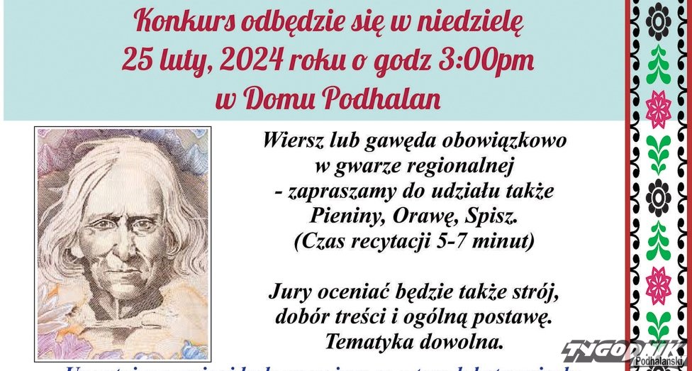 Tegoroczna edycja Konkursu Poezji i Gawędy Góralskiej odbędzie się w niedzielę 25 lutego o godz. 3 p.m. w Domu Podhalan.Uczestnicy muszą zaprezentować wiersz lub gawędę w gwarze regionalnej. To konkurs nie tylko dla Podhalan, ale także górali z Pienin, Orawy i Spisza. Jury oceniać będzie także strój, dobór treści i ogólną postawę.