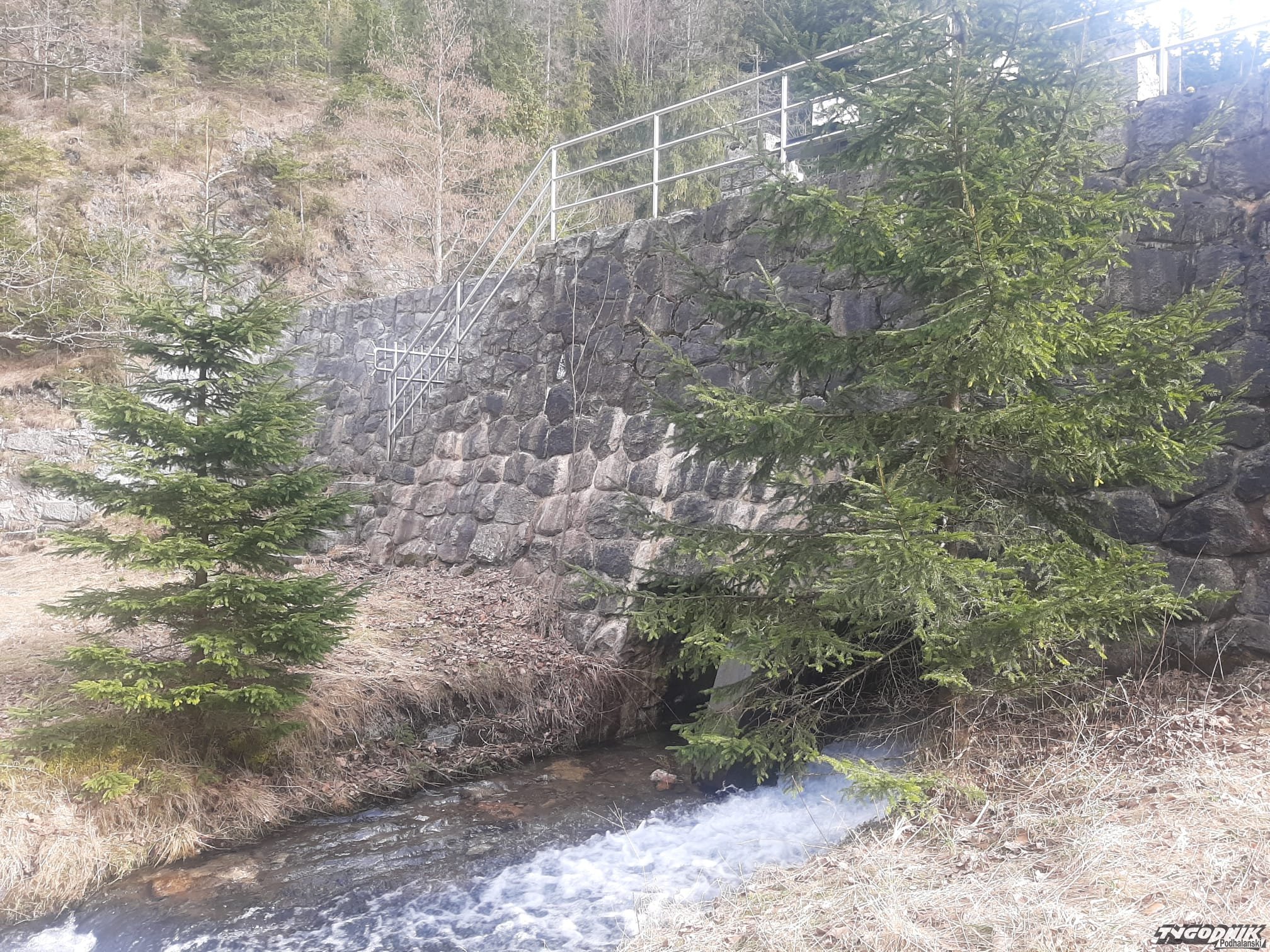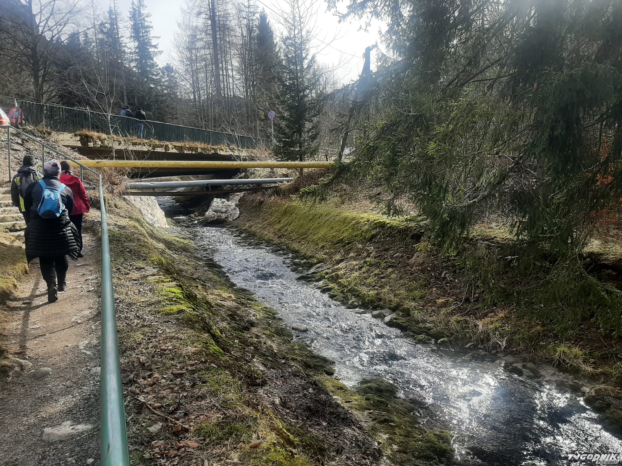 Wiosenna aura stopiła już sporo śniegu, w potoku Bystra bardzo niski poziom wody.