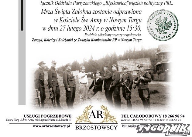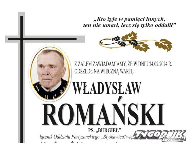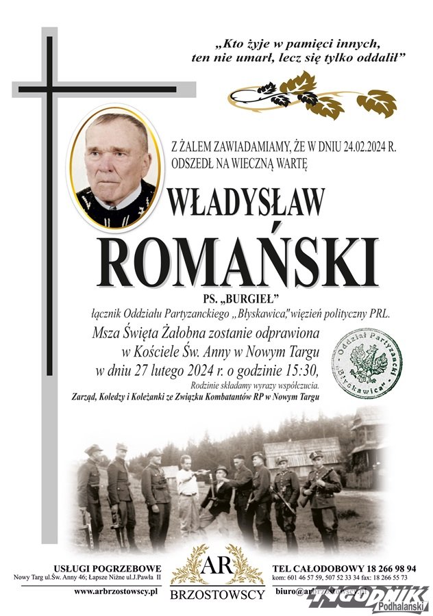 O śmierci kolegi informuje Związek Kombatantów RP w Nowym Targu. Na wieczną wartę odszedł Władysław Romański ps. "Burgieł". Msza święta żałobna za duszę zmarłego odprawiona zostanie we wtorek 27 lutego o godz. 15.30 w Kościele Świętej Anny w Nowym Targu.