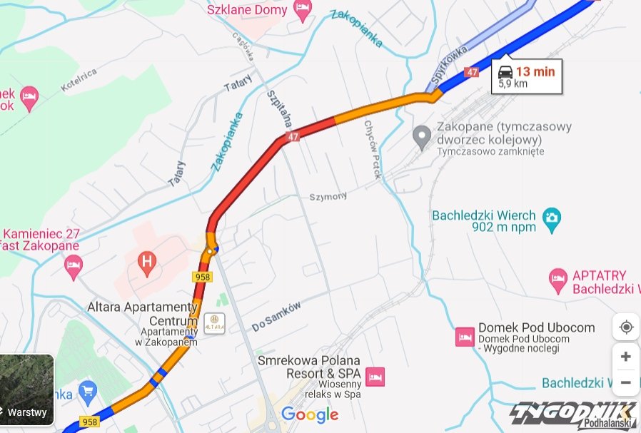 Trwa malowanie poziomych znaków przy wjeździe do Zakopanego.