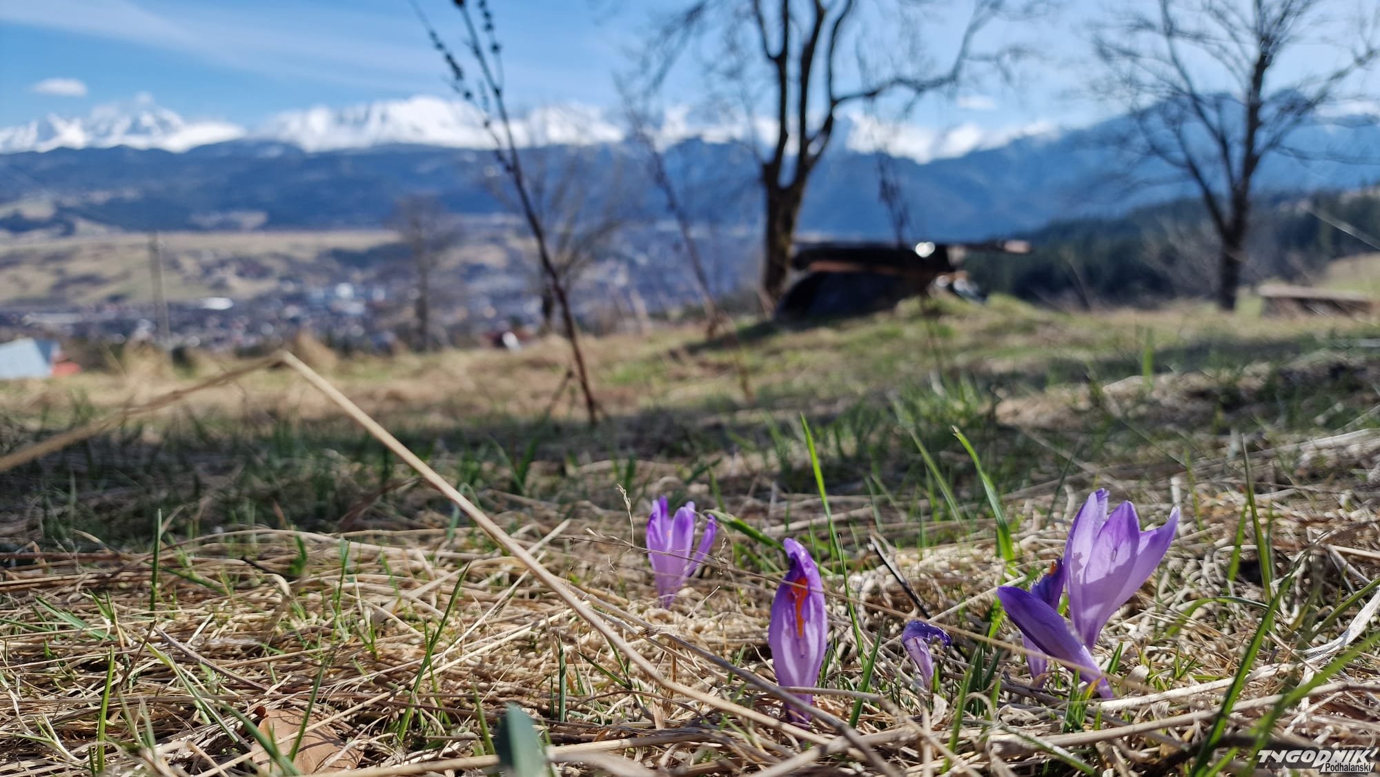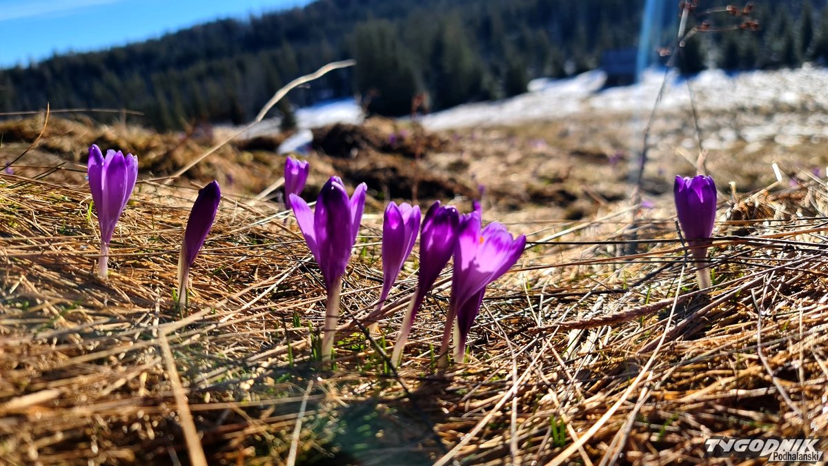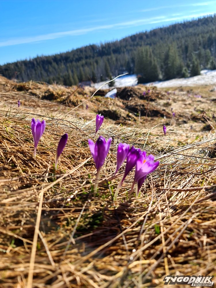 Te niżej położone tatrzańskie łąki już bez śniegu. Zarówno w górach, jak i na Podhalu kwitną krokusy.