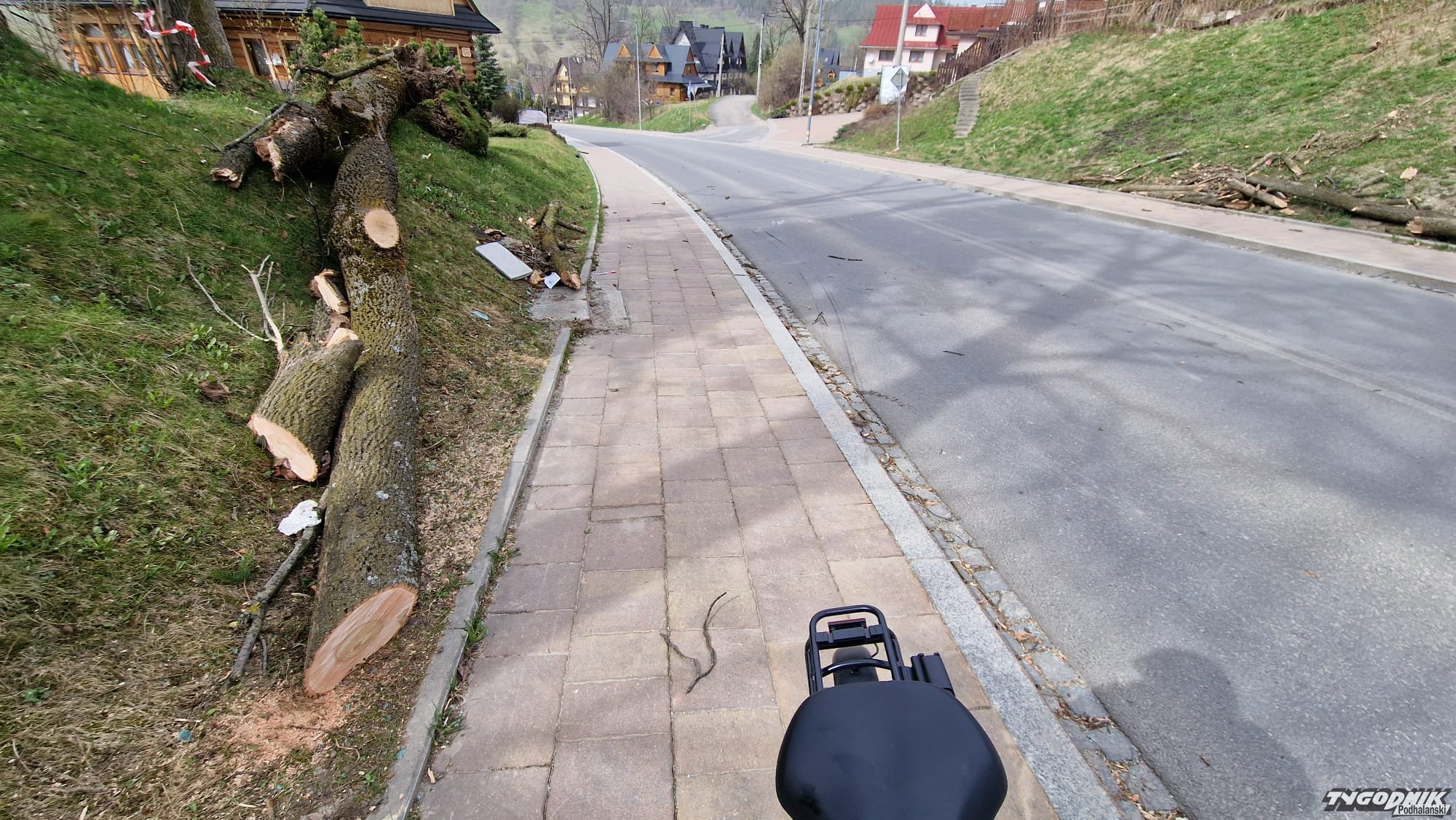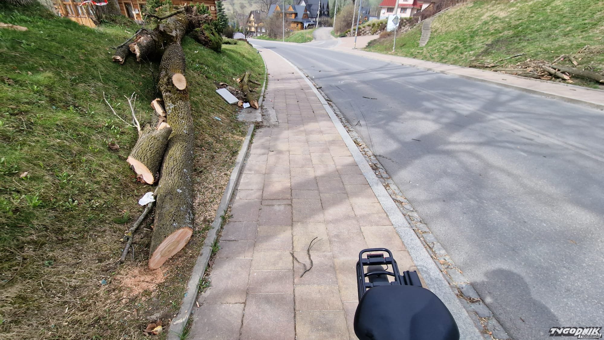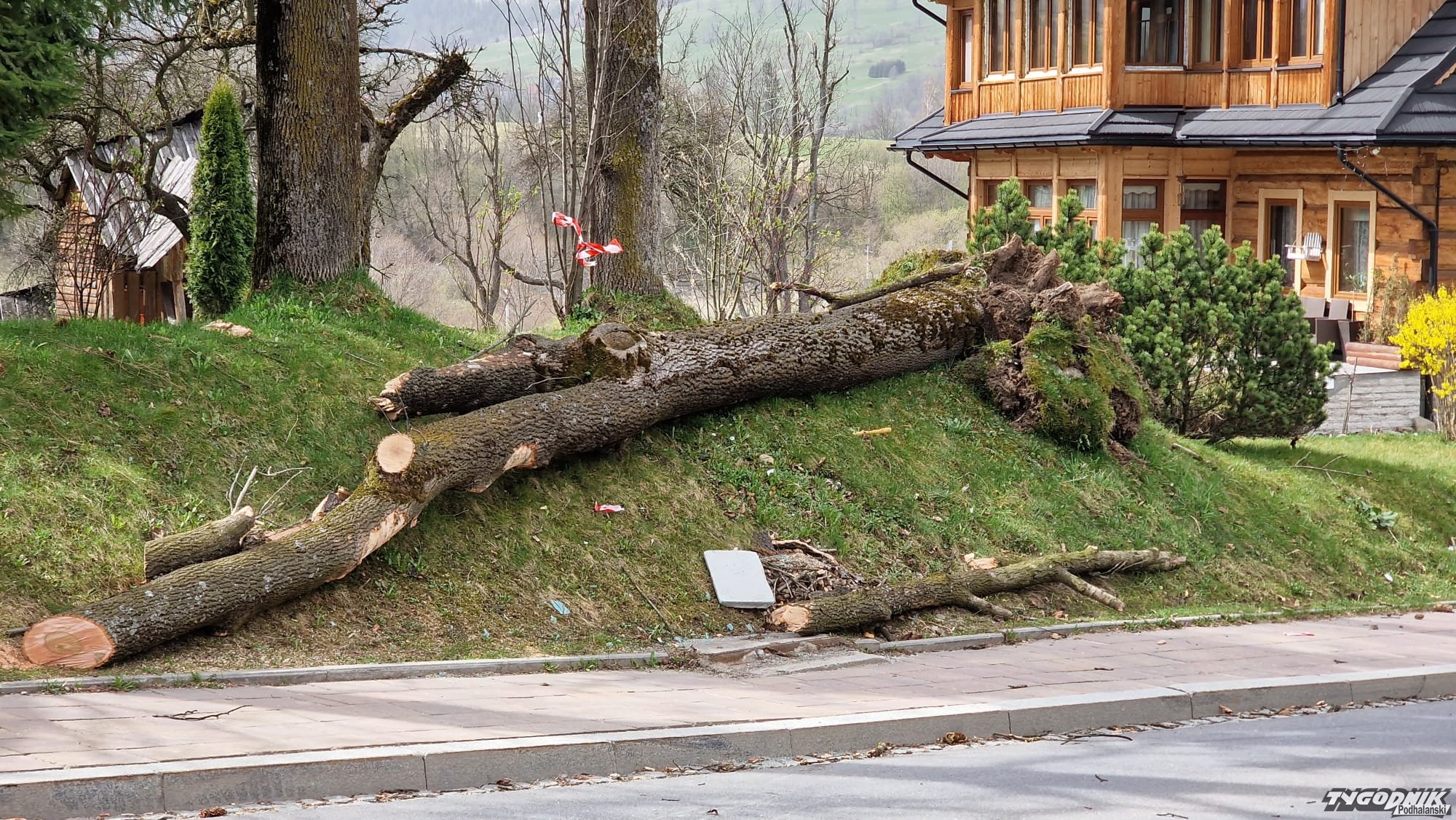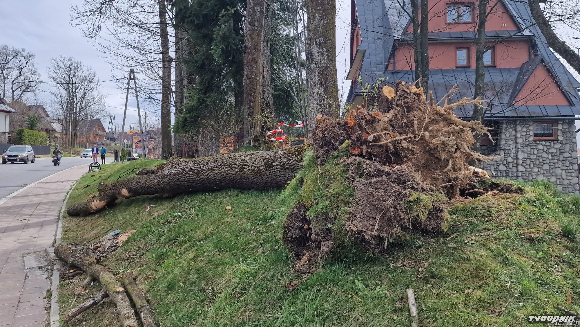 Tak wygląda powalone drzewo, które spadło na samochód na Olczy w Zakopanem. W wypadku zginęła młoda kobieta.