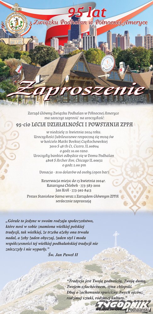 Już w najbliższą niedzielę 21 kwietnia Związeku Podhalan w Północnej Ameryce będzie świętował 95-lecie działllności.