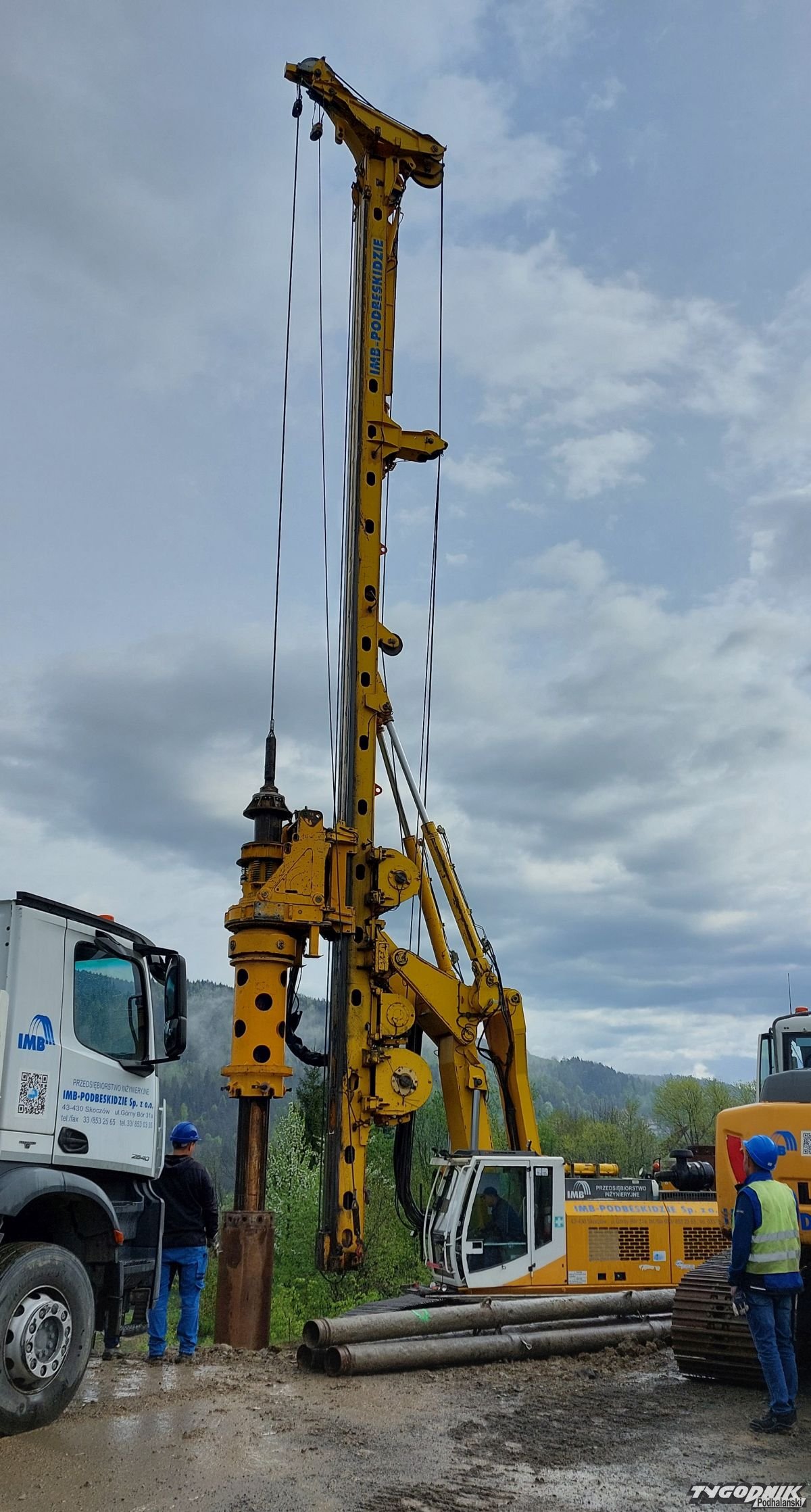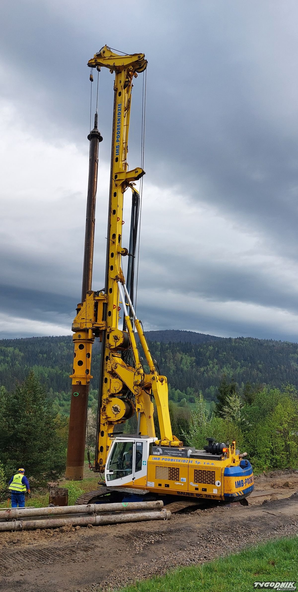 Palownica wierci w terenie otwory o głębokości 20 m. W trzech rzędach powstanie łącznie 96 pali.
