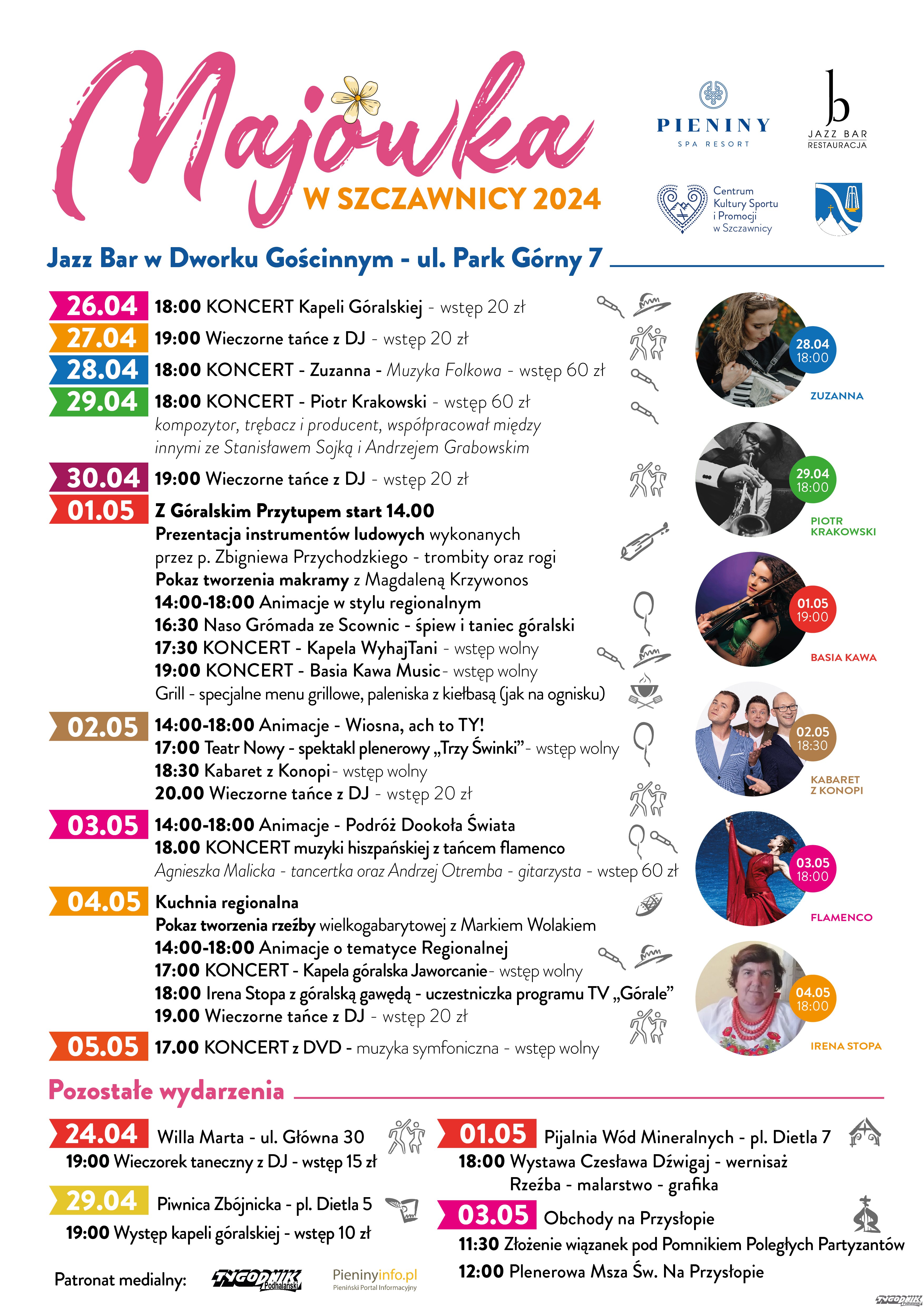 Na większość wydarzeń w ramach "Majówki w Szczawnicy" zaprasza Jazz Bar w Dworku Gościnnym (ul. Park Górny 7).