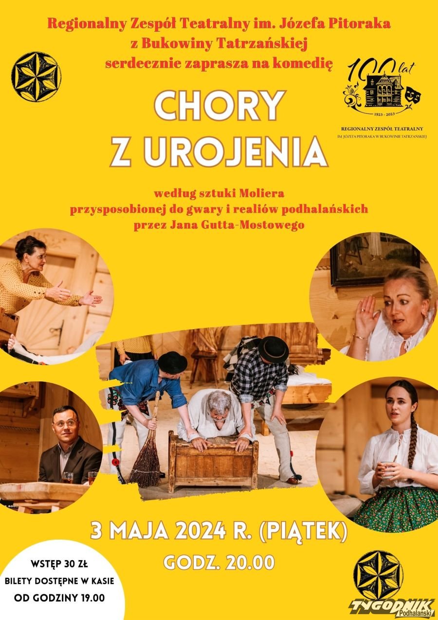 Również w piątek 3.05, ale o godzinie 20: Sztuka teatralna „Chory z urojenia” – Regionalny Zespół Teatralny im. Józefa Pitoraka z Bukowiny Tatrzańskiej.