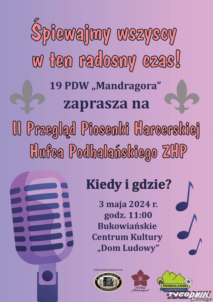 Będzie to II Festiwal Piosenki Harcerskiej Hufca Podhalańskiego ZHP „Śpiewajmy wszyscy w ten radosny czas” organizowany przez 19. Podhalańską Drużynę Wędrowniczą „Mandragora”.