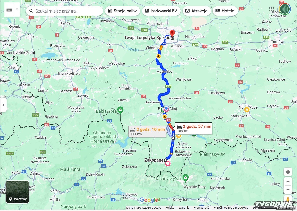 Już teraz mapy Google pokazują, że tradycyjnie między Nowym Targiem a Klikuszową utworzył się spory korek. Ale to nie jedyne miejsce z problemami. Samochody zwalniają też w Szaflarach, Poroninie czy już na wyjeździe z Zakopanego. Przejazd z Zakopanego do Krakowa tą trasa zajmuje już 3 godziny. Niespełna godzinę mniej powinien - na tę chwilę - potrwać przejazd trasą alternatywną przez Czarny Dunajec czy przez Ludźmierz.