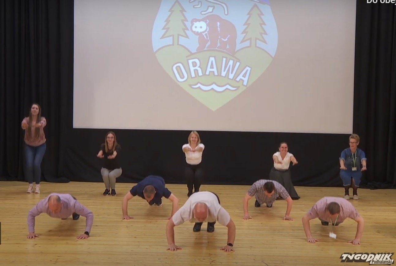 Nowy włodarz Jabłonki otoczony swymi urzędnikami robił pompki na scenie Orawskiego Centrum Kultury a wszystko w zbożnym celu.