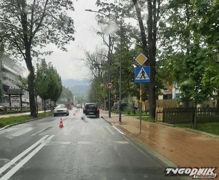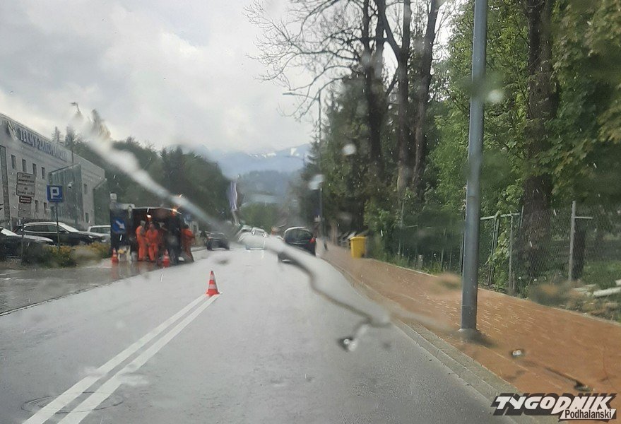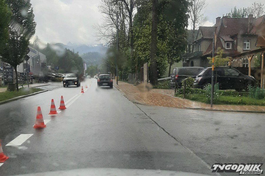 Od rana na ulicy Jagiellońskiej w Zakopanem utrudnienia. Wczoraj ekipa drogowców rozpoczęła malowanie jezdni po zimie. Gdy część ulicy dostała już świeże, białe pasy i przerywane linie, z nieba lunęło. Pierwsza fala deszczu skutecznie wstrzymała prace ekipy malarskiej. Gdy pogoda w kratkę, malowanie jezdni staje się nie lada wyzwaniem. Tylko czy jest sens nakładać farby, gdy meteorolodzy i służby mundurowe przestrzegają przed gwałtownymi burzami? Kiedyś trzeba to zrobić. Dziś mamy okno pogodowe, prace z pewnością uda się dokończyć.