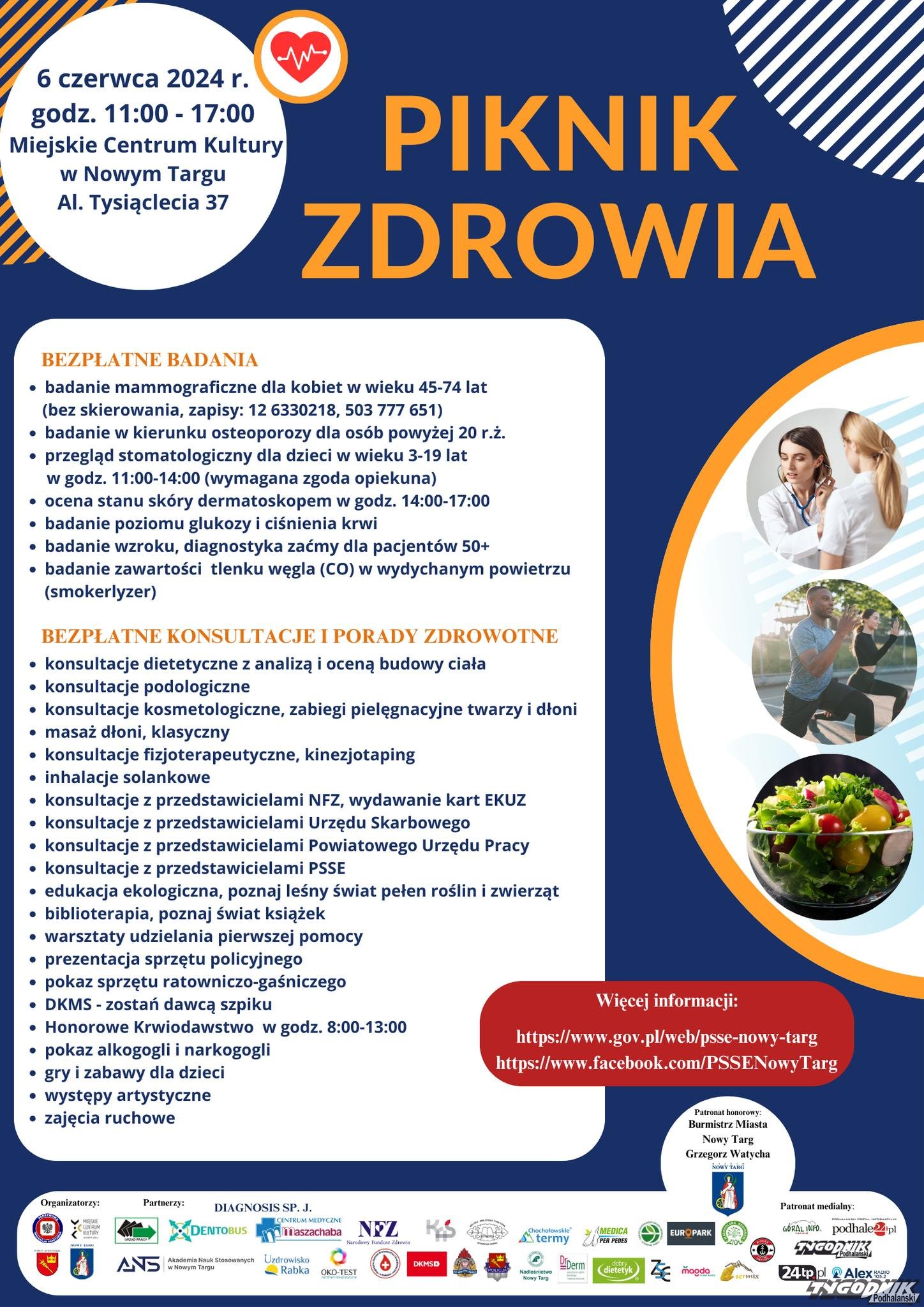 Piknik Zdrowia odbędzie się 6 czerwca w Miejskim Centrum Kultury w Nowym Targu, Dziać będzie się dużo w samym budynku i w jego sąsiedztwie. W programie są bezpłatne badania, konsultacje i porady zdrowotne. Będą różne punkty informacyjne. Nie zabraknie występów artystycznych, a dla dzieci gier i zabaw.