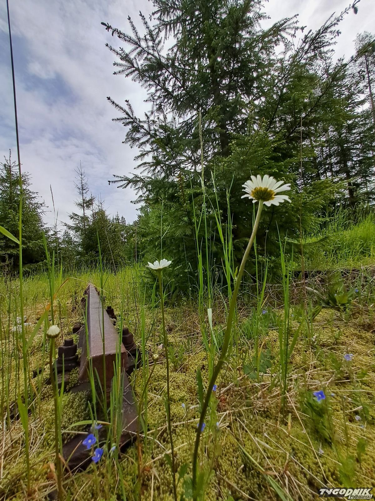 Stare, zardzewiałe szyny można jeszcze zauważyć pomiędzy zarastającymi je drzewami.
