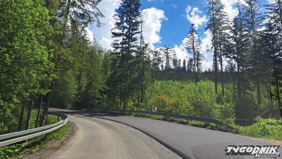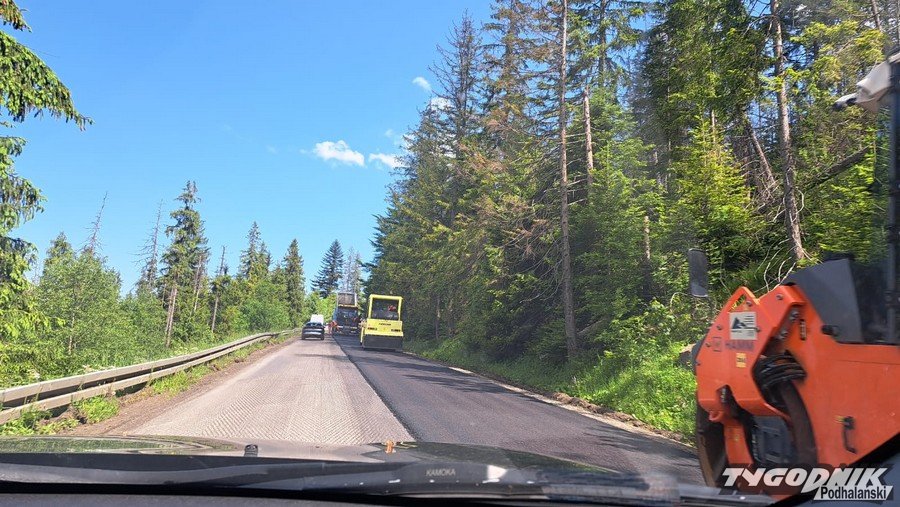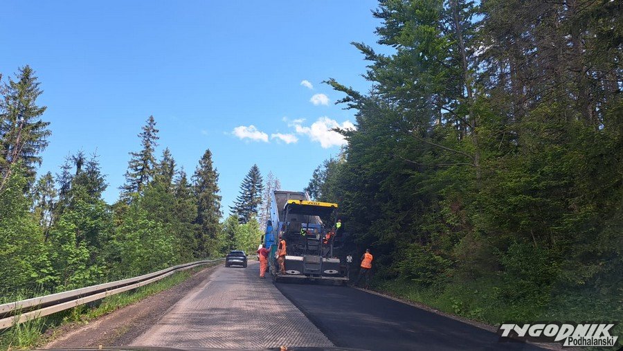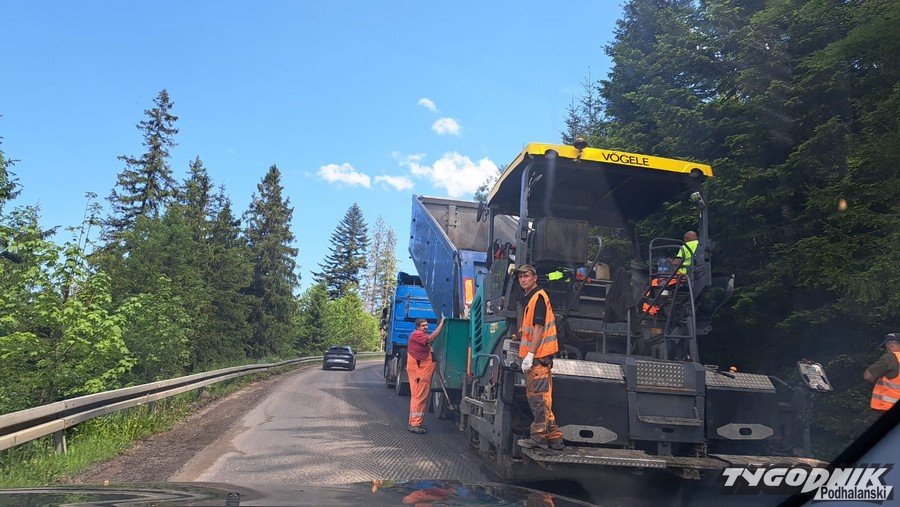 Drogowcy kładą asfalt, na krętej drodze mogą tworzyć się korki.