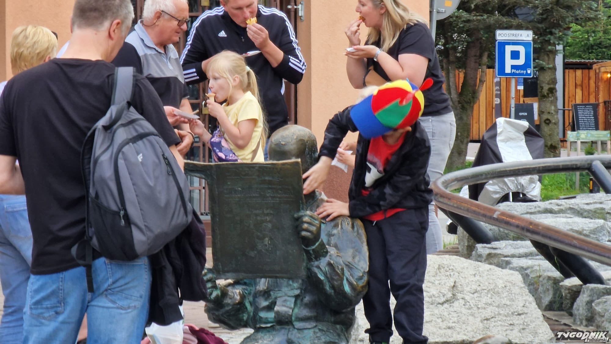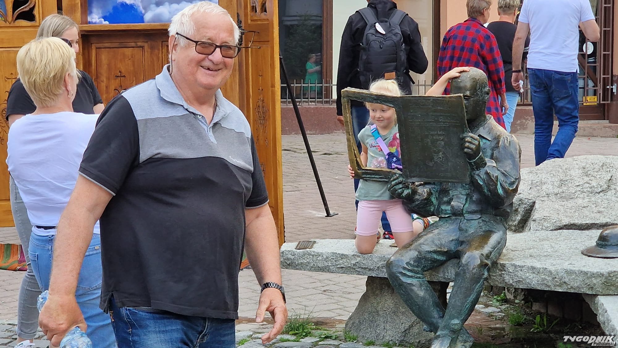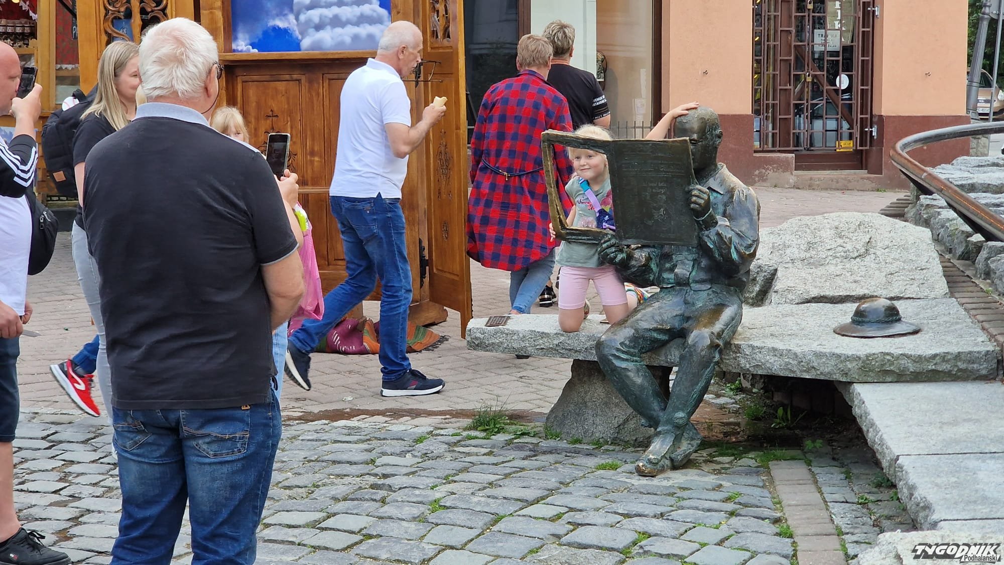 Dokładnie to Karol Gąsienica Szostak na nasze zlecenie wyrzeźbił górala z Tygodnikiem w ręku. Okazją był jubileusz Tygodnika Podhalańskiego. Okładka miała być tylko ramką, by każdy turysta mógł wstawić do niej głowę i pojawić się na niej. Teksty w gazecie aktualne na dzień odsłonięcia ławeczki. Jak dziś, po 14 latach jest to atrakcyjne miejsce dla gości Zakopanego, zobaczcie na tym 3 min filmie. Duma nas rozpiera. Przypomnijmy, podobną ławeczkę, ale z góralką ufundowaliśmy w Nowym Targu. Siedzi na Rynku i czytając Tygodnik zajada się lodami. Jest wyjątkowo piękna.