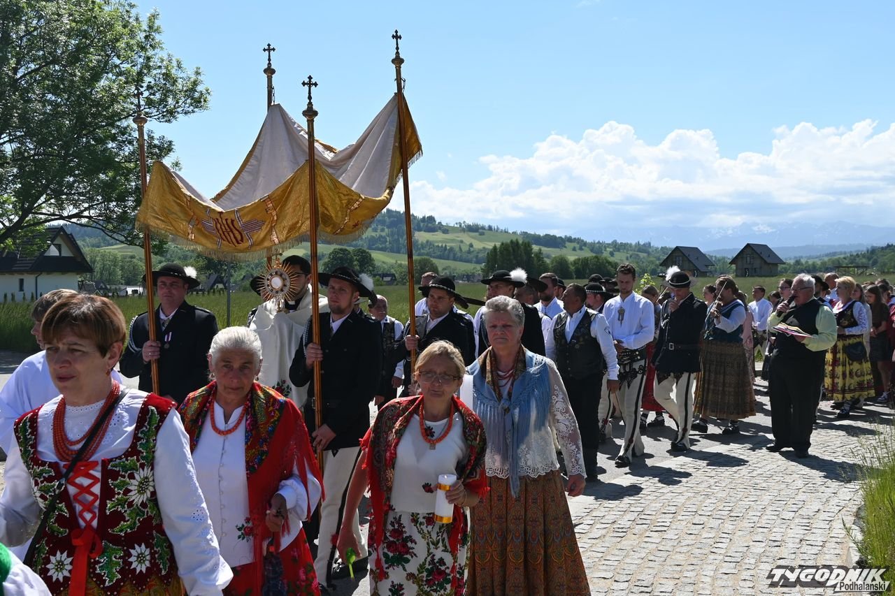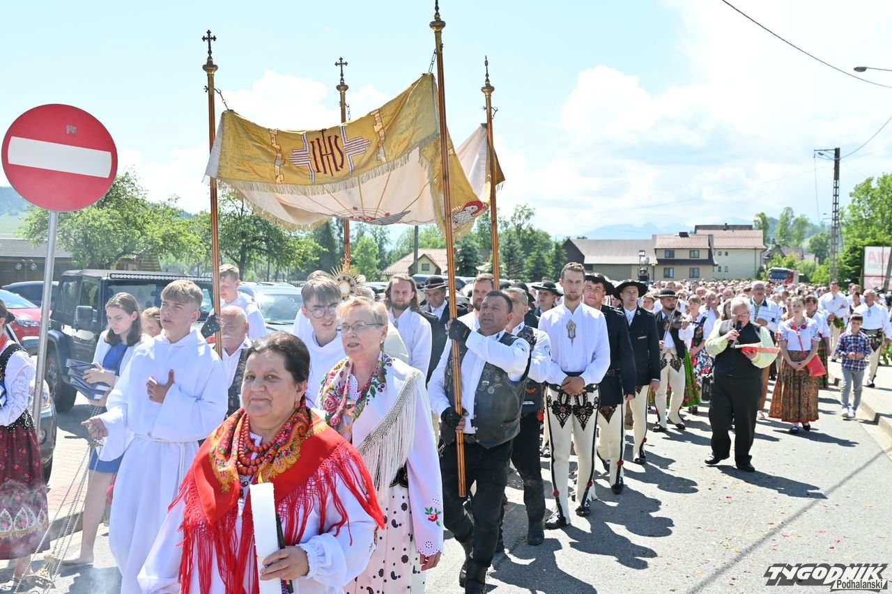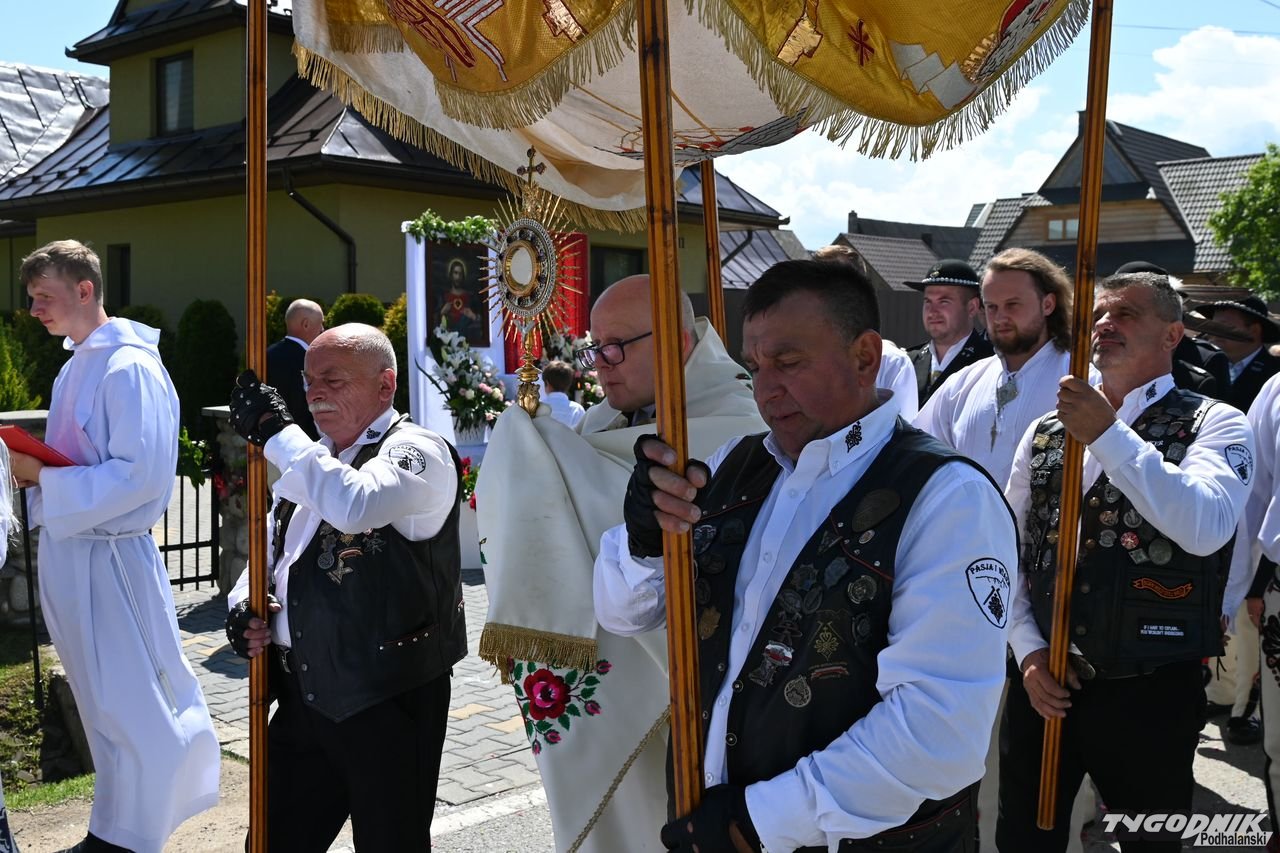 Na procesji górale i góralki nieśli chorągwie, feretrony z różnymi świętymi, m.in. św. Janem Pawłem II. Z kolei baldachim, pod którym ks. proboszcz Janusz Rzepa na przemian z ks. wikarym Arturem Kulakiem nieśli monstrancję z Najświętszym Sakramentem, trzymali dorośli górale w strojach regionalnych i motocykliści z grupy "Pasja i Wiara" z Miętustwa.