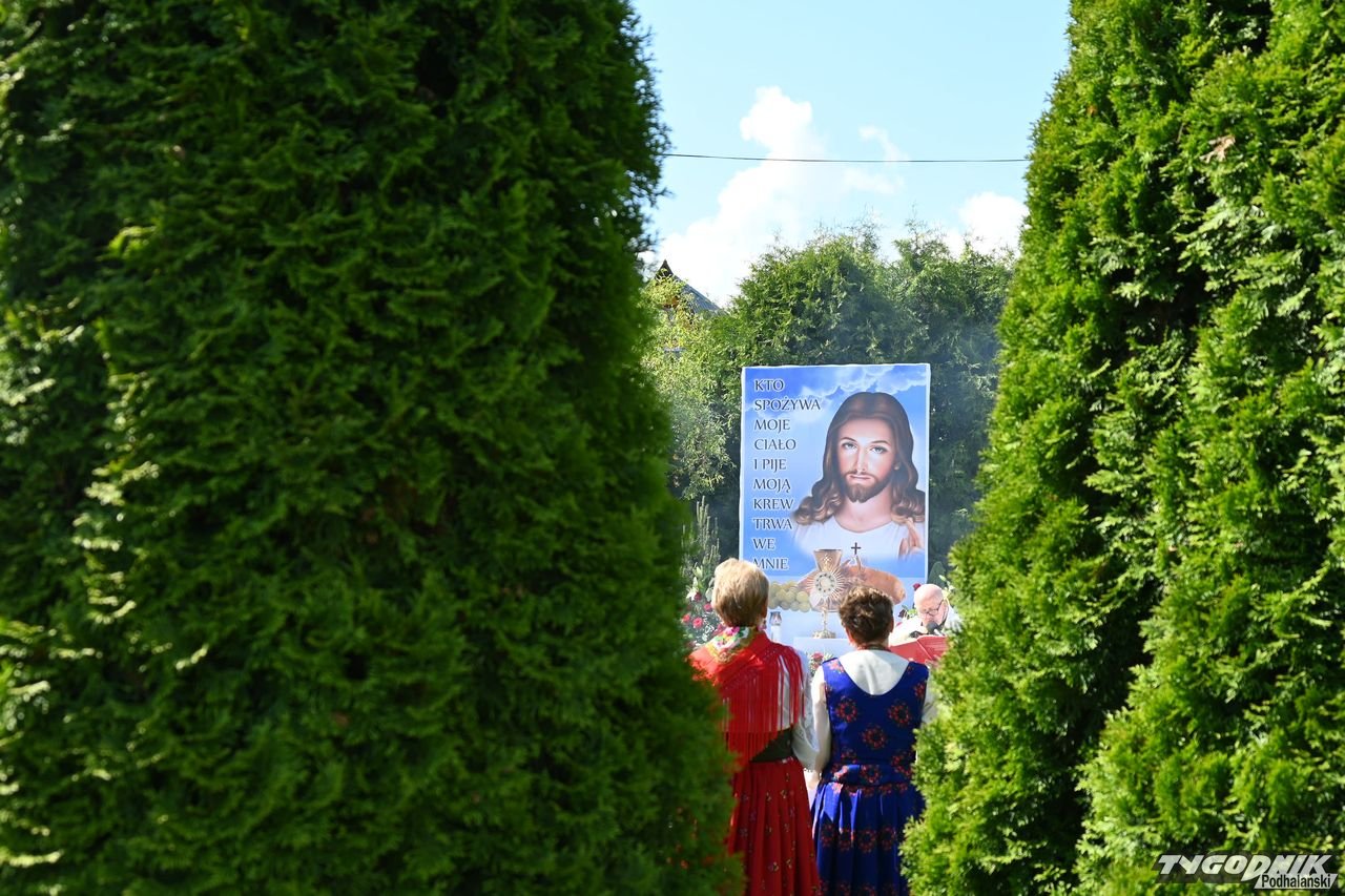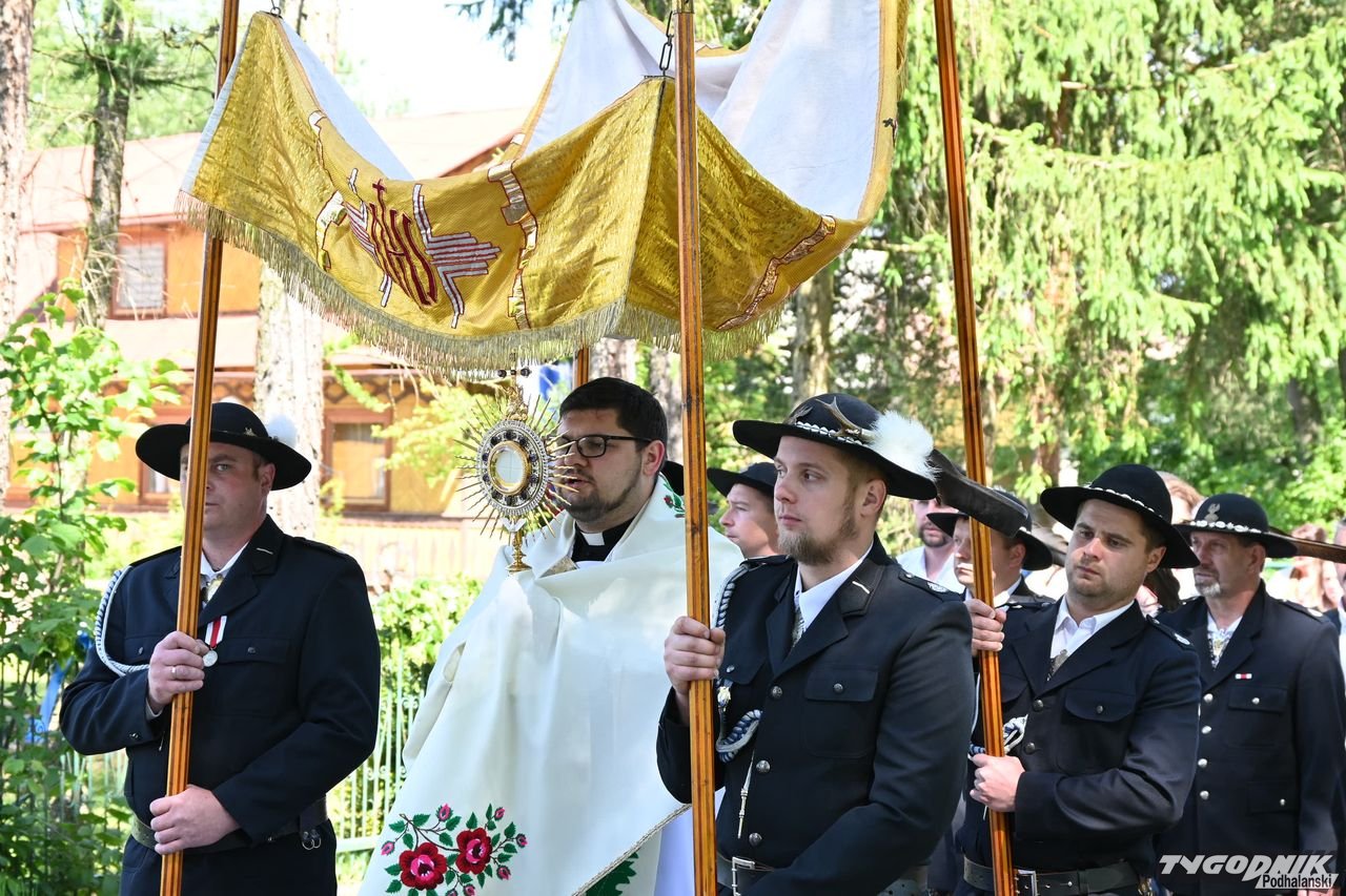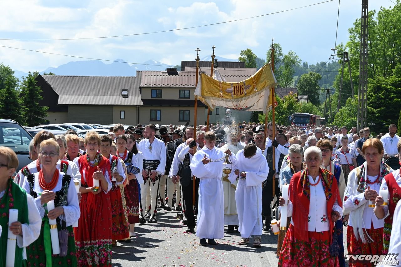 Na procesji górale i góralki nieśli chorągwie, feretrony z różnymi świętymi, m.in. św. Janem Pawłem II. Z kolei baldachim, pod którym ks. proboszcz Janusz Rzepa na przemian z ks. wikarym Arturem Kulakiem nieśli monstrancję z Najświętszym Sakramentem, trzymali dorośli górale w strojach regionalnych i motocykliści z grupy "Pasja i Wiara" z Miętustwa.