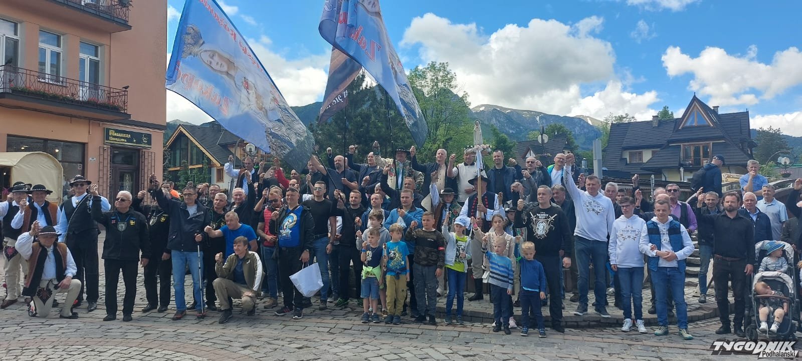 Mężczyźni z różańcem w ręku modlą się na Krupówkach