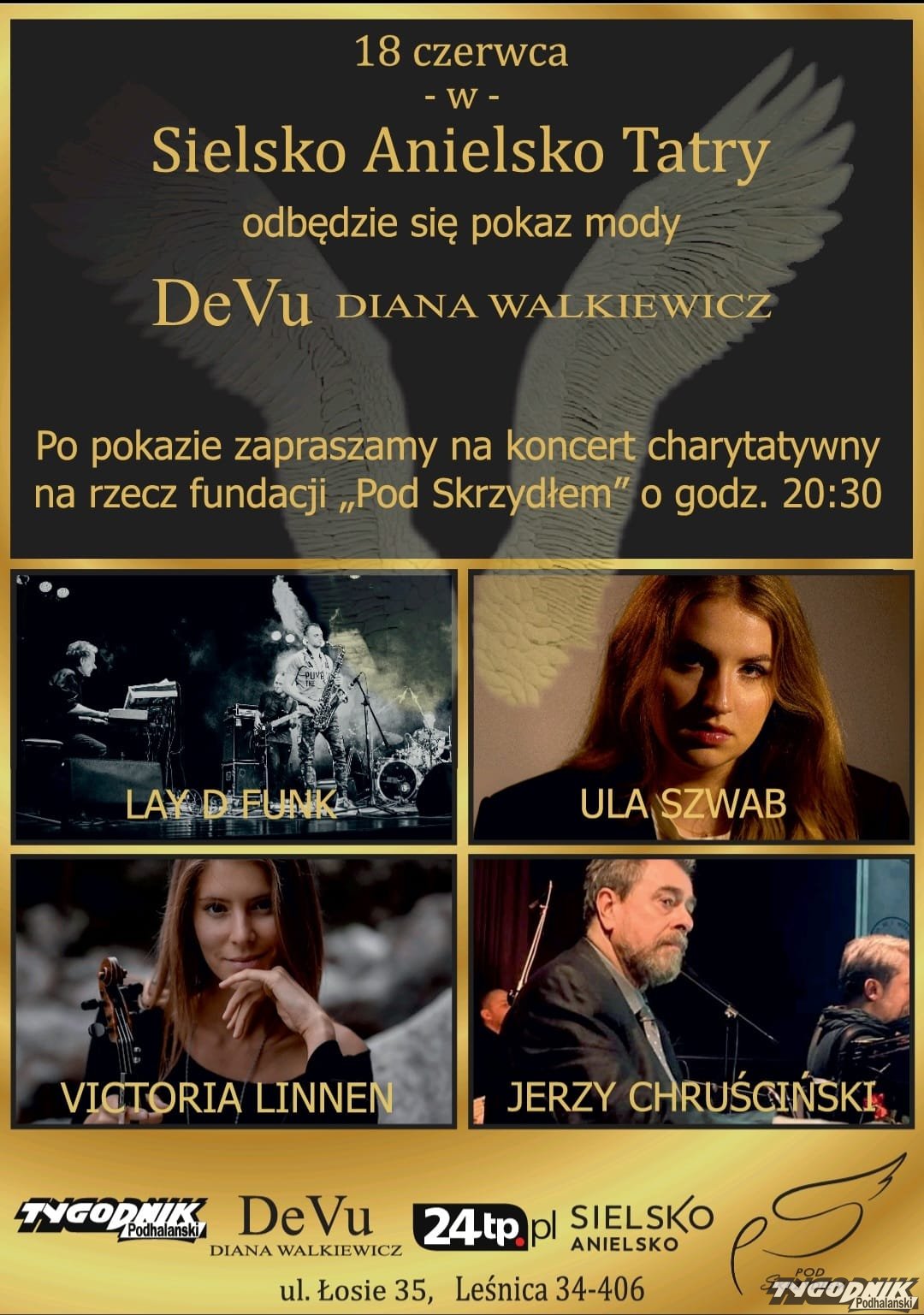 To już druga edycja pokazu mody w Sielsko Anielsko Tatry w Leśnicy (ul. Łosie 35) z udziałem Diany Walkiewicz, projektantki wielokrotnie nagradzanej, twórczyni marki DeVu . Po pokazie odbędzie się koncert charytatywny na rzecz fundacji "Pod Skrzydłem". Wystąpią: Lay D Funk, Ula Szwab, Vivtoria Linnen oraz Jerzy Chruściński. Początek godz. 18 30