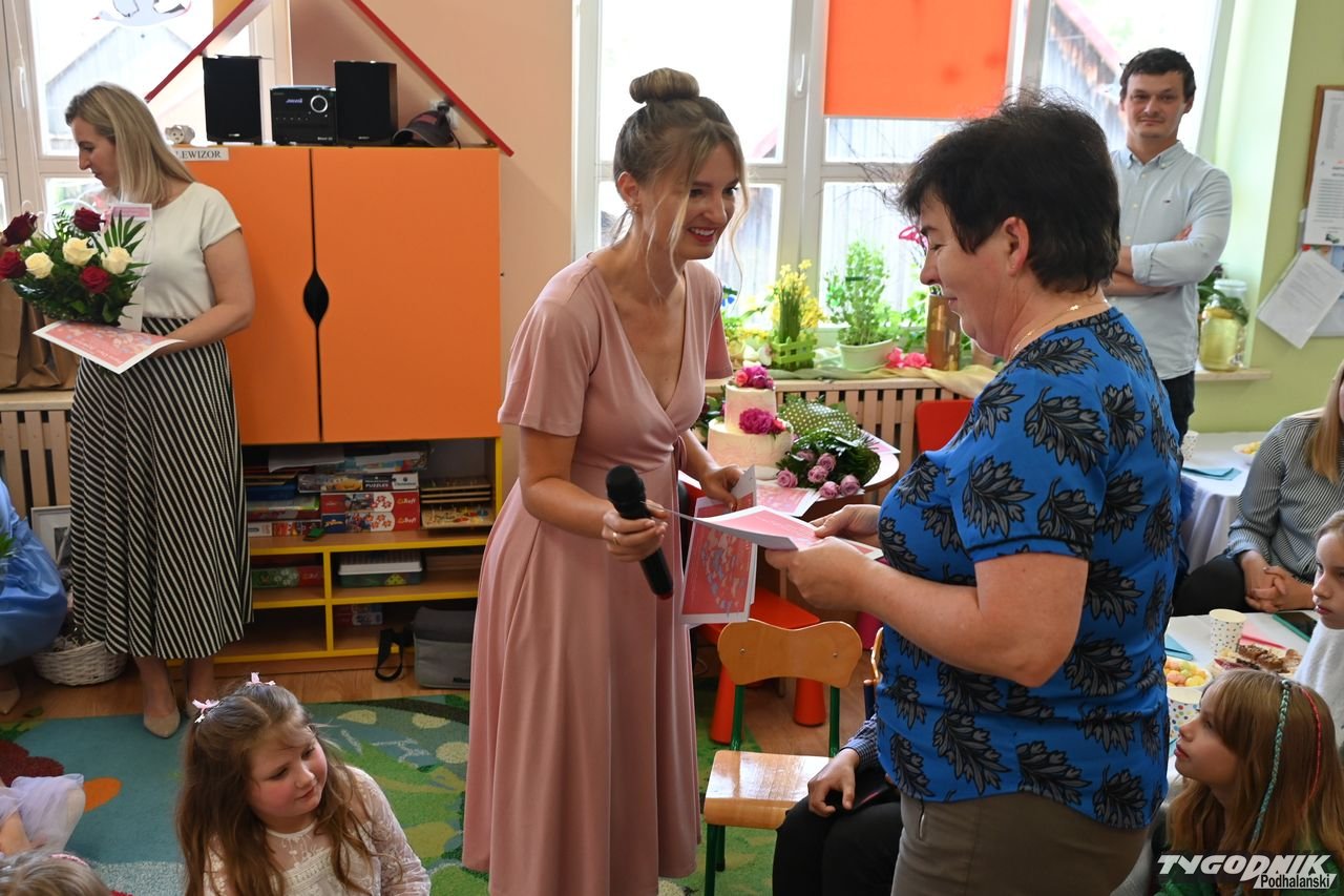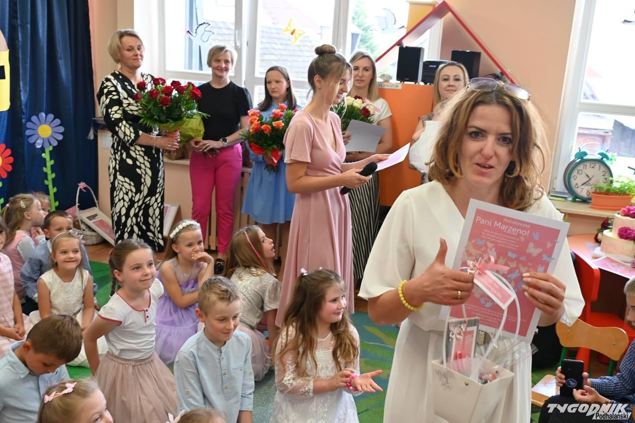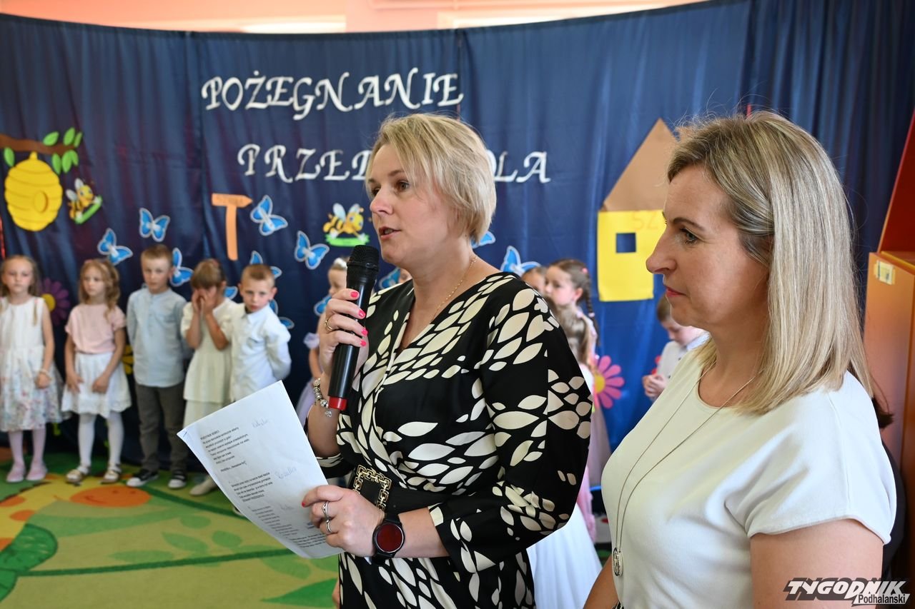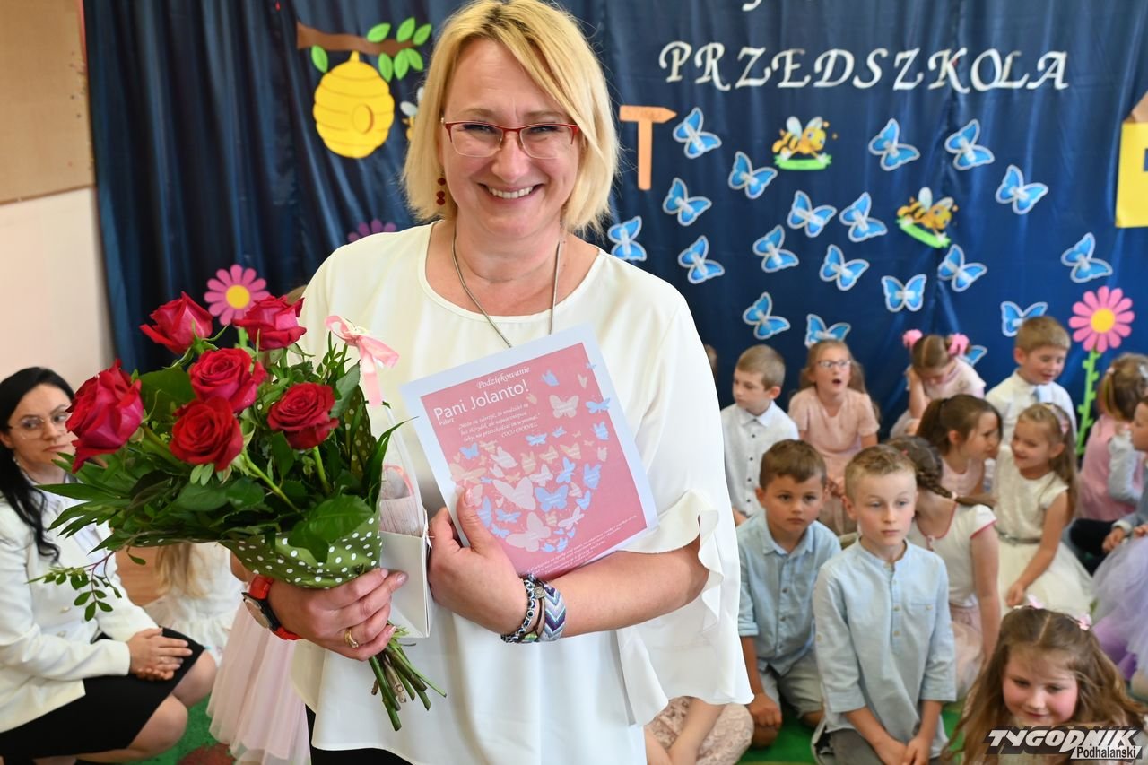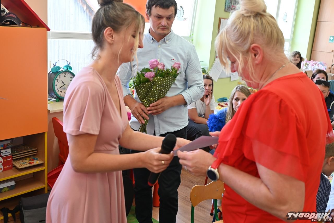 Wszystkich zgromadzonych pozdrowiła Aneta Karkula, p.o. dyrektora placówki. Słowa podziękowań wypowiedziała zaś Katarzyna Miętus, wychowawczyni grupy "Motylki". Głos zabrały również panie Katarzyna Barnaś i Dominika Staszel związane z grupą zerówką. Rodzice nie zapomnieli także o drobnych upominkach i kwiatach dla pań wychowawczyń i całej kadry pedagogicznej, a także dla wszystkich innych pracowników przedszkola.