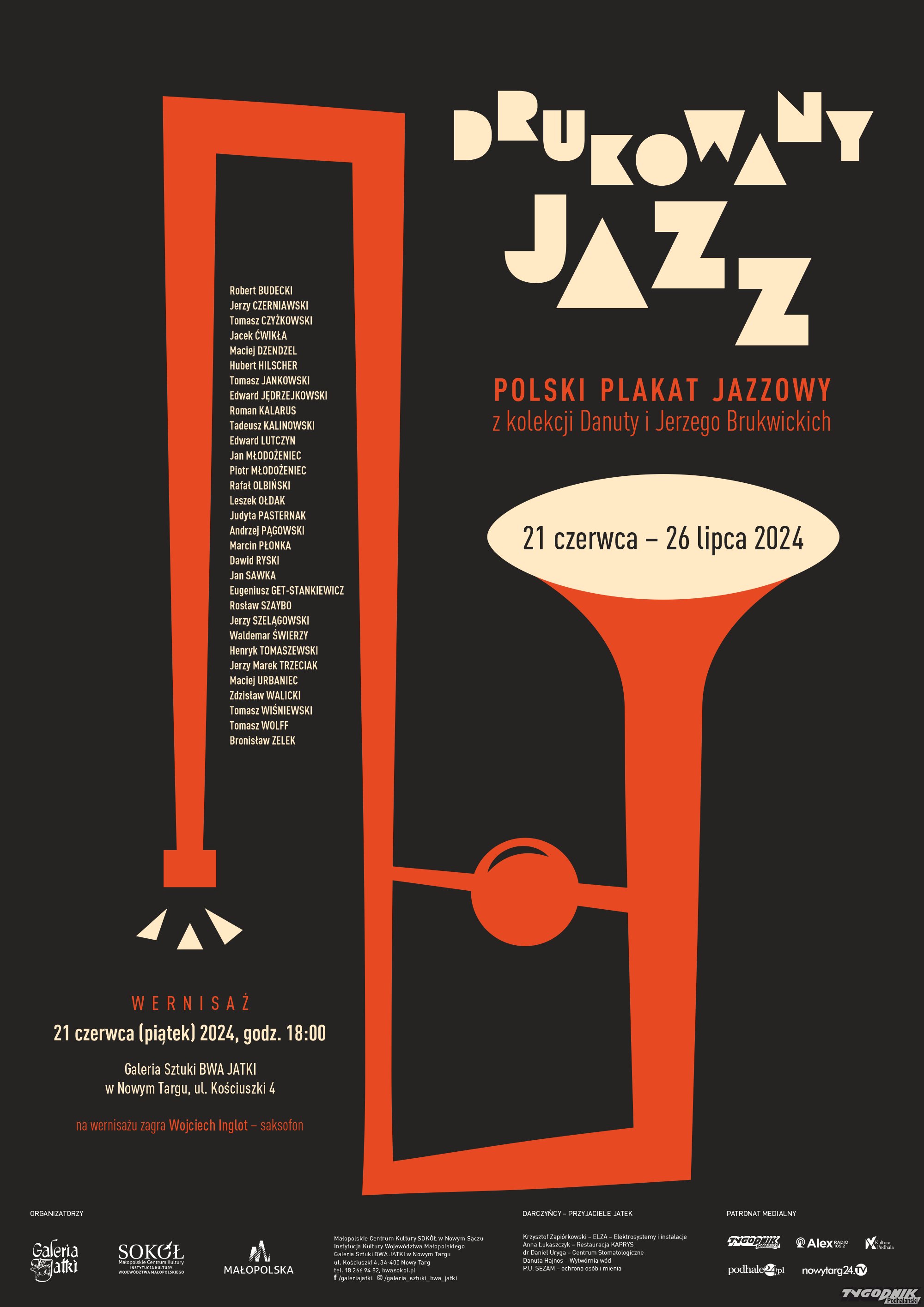 Galeria Sztuki BWA JATKI w Nowym Targu zaprasza na wystawę pt. " Drukowany jazz - polski plakat jazzowy z kolekcji Danuty i Jerzego Brukwickich". Otwarcie wystawy odbędzie w piątek, 21 czerwca, o godz. 18. Spotkanie uświetni występ Wojciecha Inglota, który zagra na saksofonie. Wystawę będzie można oglądać do 26 lipca.
