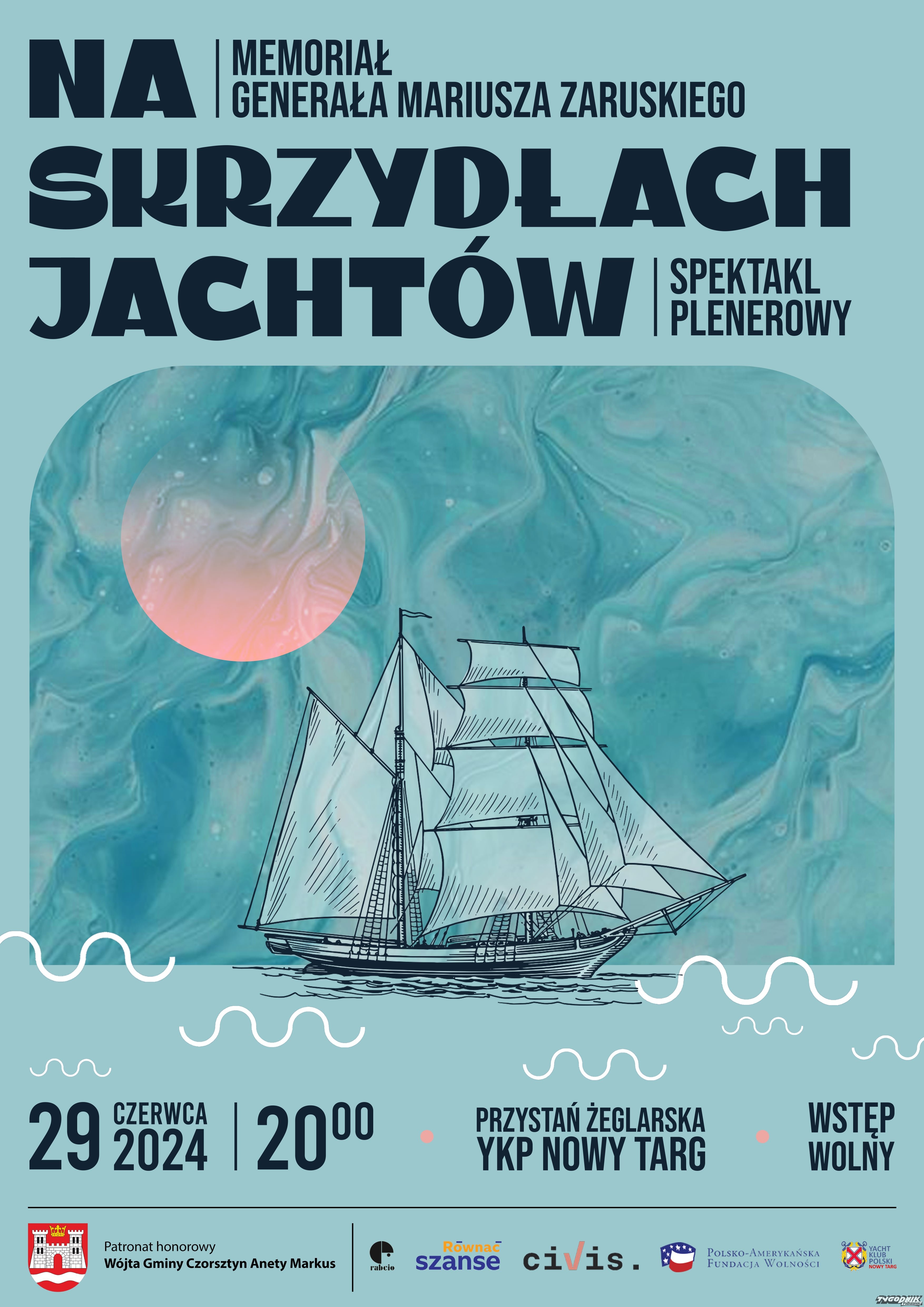 Widowisko "Na skrzydłach jachtów" przygotowali aktorzy Teatru Lalek Rabcio z Młodzieżową Grupą Teatralną Przyjaciele Rabcia. Spektakl łączy taniec, grę aktorską oraz różnorodne techniki animacji. Scenariusz oparty jest na poezji „Sonety morskie” oraz na dziennikach żeglarskich autorstwa gen. Mariusza Zaruskiego.