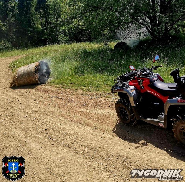 Paliły się bale siana w trudno dostępnym terenie, strażacy dojeżdżali na quadach