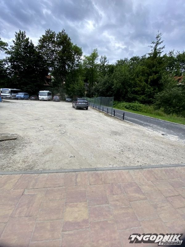 jednej z działek parkują autobusy i samochody osobowe. Tak wygląda chodnik i o zgrozo jezdnia.