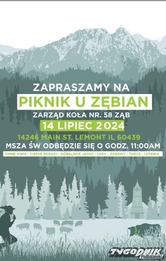 Na Piknik u Zębian zaprasza Koło nr 58 Związku Podhalan Północnej Ameryki. Wcześniej, o godz. 11 a.m. odbędzie się Msza św. w Slovenian Catholic Mission w Lemont.