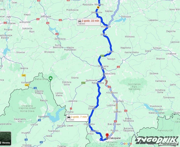 Piękna pogoda jaka szykuje się na nadchodzący weekend plus wakacje - nic dziwnego, że wielu turystów ruszyło zdobywać Tatry. A przynajmniej by je zobaczyć z perspektywy Krupówek. Jak pokazuje aktualna google map, mamy już spory korek między Nowym Targiem i Szaflarami i kolejny od Chabówki, przez Rdzawkę po Klikuszową. - Zakopianka korkuje się praktycznie zaraz po wyjeździe z tunelu. Stoimy i końca korka nie widać - alarmuje jedna z naszych Czytelniczek.