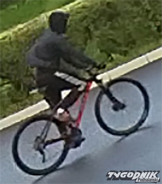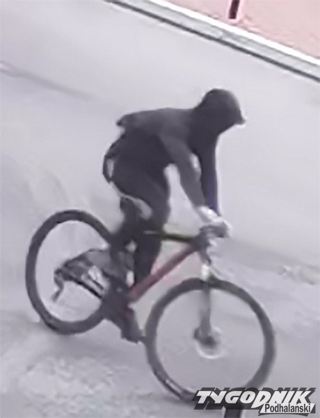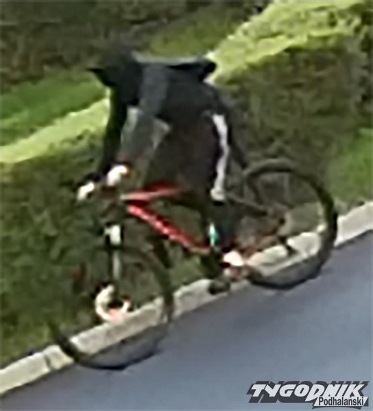 Osobnik ubrany był w czarną bluzę dresową z kapturem, czapkę z daszkiem, rękawice i skarpety koloru białego lub jasnego, spodnie dresowe czarne z białymi pasami na zewnętrznych częściach nogawek (na udach), buty niskie typu sportowego. Miał zasłoniętą twarz. Posiadał granatowy plecak typu duża nerka. Poruszał się na rowerze górskim koloru czerwono-czarnego z napisem na ramie - hamulce tarczowe, obręcze kół czarne, mostek kierownicy typu długiego (dodatkowe szczegóły będziemy udostępniać sukcesywnie).