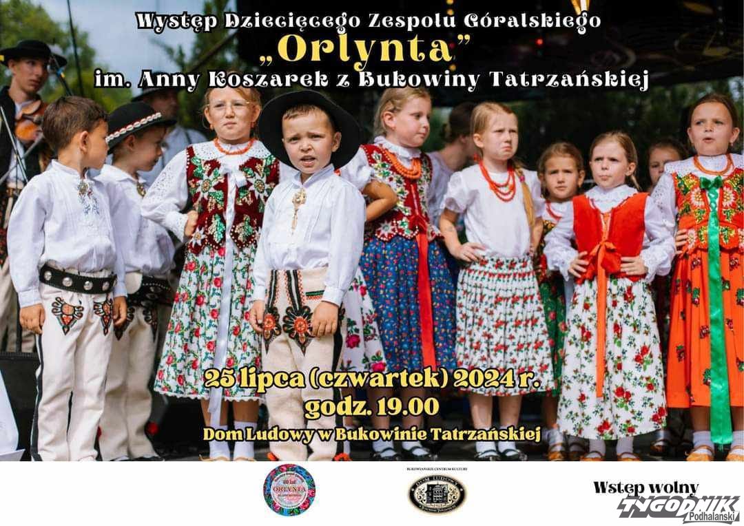 Dziecięcy zespół "Orlynta" z Bukowiny Tatrzańskiej jest wyjątkowy, bo tańczą w nim bardzo nawet bardzo małe dzieci. Jeszcze dobrze nie mówią, a już krzesają" i "drobią", aż iskry spod kierpiec lecą. Wyjątkowy nie tylko ze względu na wiek małych "tonecników", ale przede wszystkim ich umiejętności taneczne i śpiewacze. Wyjątkowy także ze względu na ich prawdziwość, szczerość i emocje, które udzielają się widowni. Są dowodem na to, że góralskie geny wysysa się z mlekiem matki, a z nimi także niełatwe kroki podhalańskich tańców. Przekonać się o tym będzie można już w najbliższy czwartek 25 lipca o godz. 19. Występ odbędzie się na scenie Domu Ludowego w Bukowinie Tatrzańskiej.
