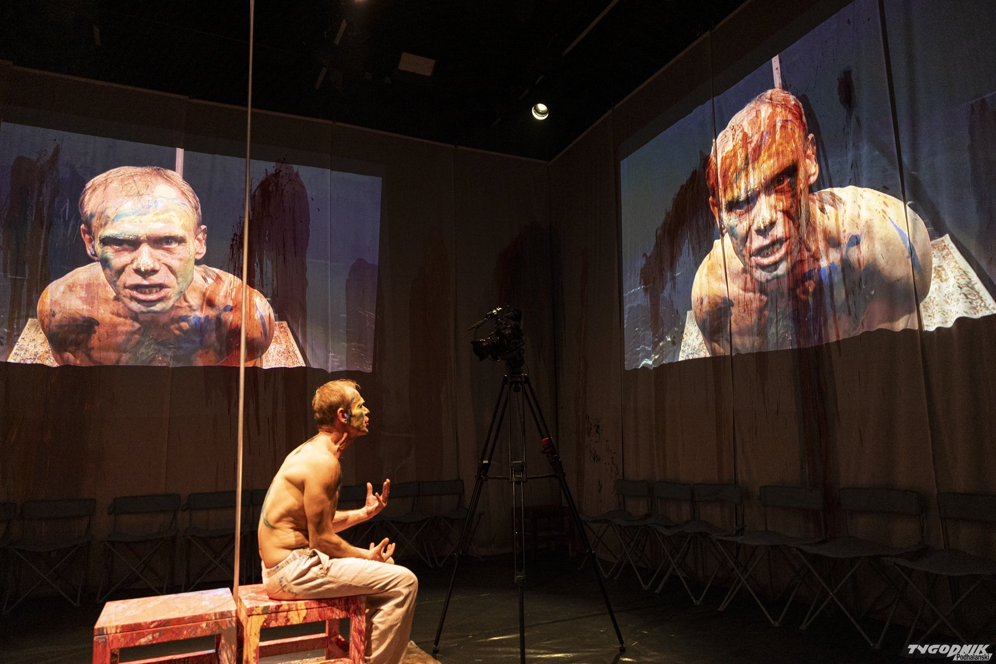 A potem monolog Bieniasa wprost do kamery ustawionej na scenie, z mocnymi zbliżeniami twarzy. Sam jest reżyserem. Przestawia kamerę, zmienia perspektywę I ekran na każdej z czterech ścian, a z ekranu, jakby do każdego z nas oddzielnie, mówi aktor. Patrząc nam w oczy opowiada swoją historię, wwierca się nią w nas. Każdy jego grymas, każde zakrzywienie ust, jest oglądane przez nas z bliska, w dużym powiększeniu, i analizowane jak pod mikroskopem.