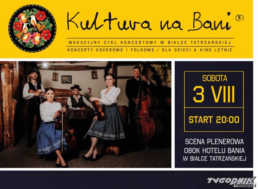 W sobotę 3.08 o godzinie 20 na scenie Kultury na Bani koncert zagra Kapela Dusa łącząca folklor karpacki z nowoczesnym brzmieniem. Zespół działa od 2022 roku i występuje w składzie: Monika Potaczek pochodząca z Olszówki, Katarzyna Kret ze Skomielnej Białej, Patryk Traczyk z Rabki-Zdroju i Piotr Kret z Nowego Targu