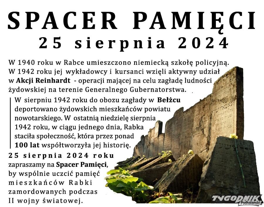 Ideą spaceru jest wspólne uczczenie pamięci mieszkańców Rabki zamordowanych w trakcie II wojny światowej. Organizatorzy zapraszają zatem wszystkich chętnych na godzinę 16 - deptak przed Kawiarnią Zdrojową przy ulicy Orkana w Rabce-Zdroju.