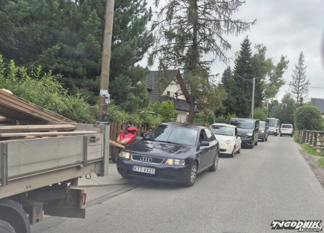 Autokary, auta osobowe, ciężarówki - kierowcy wszystkich pojazdów utknęli w potężnym korku między Zakopanem a Poroninem - przejazd pod wiaduktem na Ustupie zamknięty.