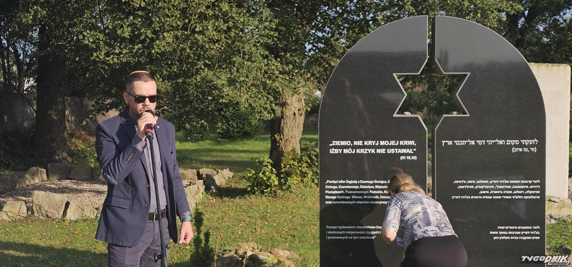 "Ziemio nie kryj mojej krwi, iżby mój krzyk nie ustawał" - te słowa z Księgi Hioba rzucają się zaraz przy wejściu na cmentarz żydowski, gdzie w środę rozpoczęły się uroczystości. Była modlitwa, a potem wspólne odczytanie na głos imion i nazwisk ofiar Zagłady z Czarnego Dunajca. Po raz pierwszy uczestniczył w obchodach Izrael Koren, który przyjechał z Izraela z żoną. Jego ojciec pochodził z Czarnego Dunajca, to Józef Korngut. Przywiózł jego dowód osobisty w języku polskim, przekazał Michałowi Szaflarskiemu, organizatorowi obchodów, z myślą o przyszłej izbie pamięci w Czarnym Dunajcu. Odnalazł pana Michała dzięki stronie www.jewishczarnydunajec.pl, która w zeszłym roku wystartowała.