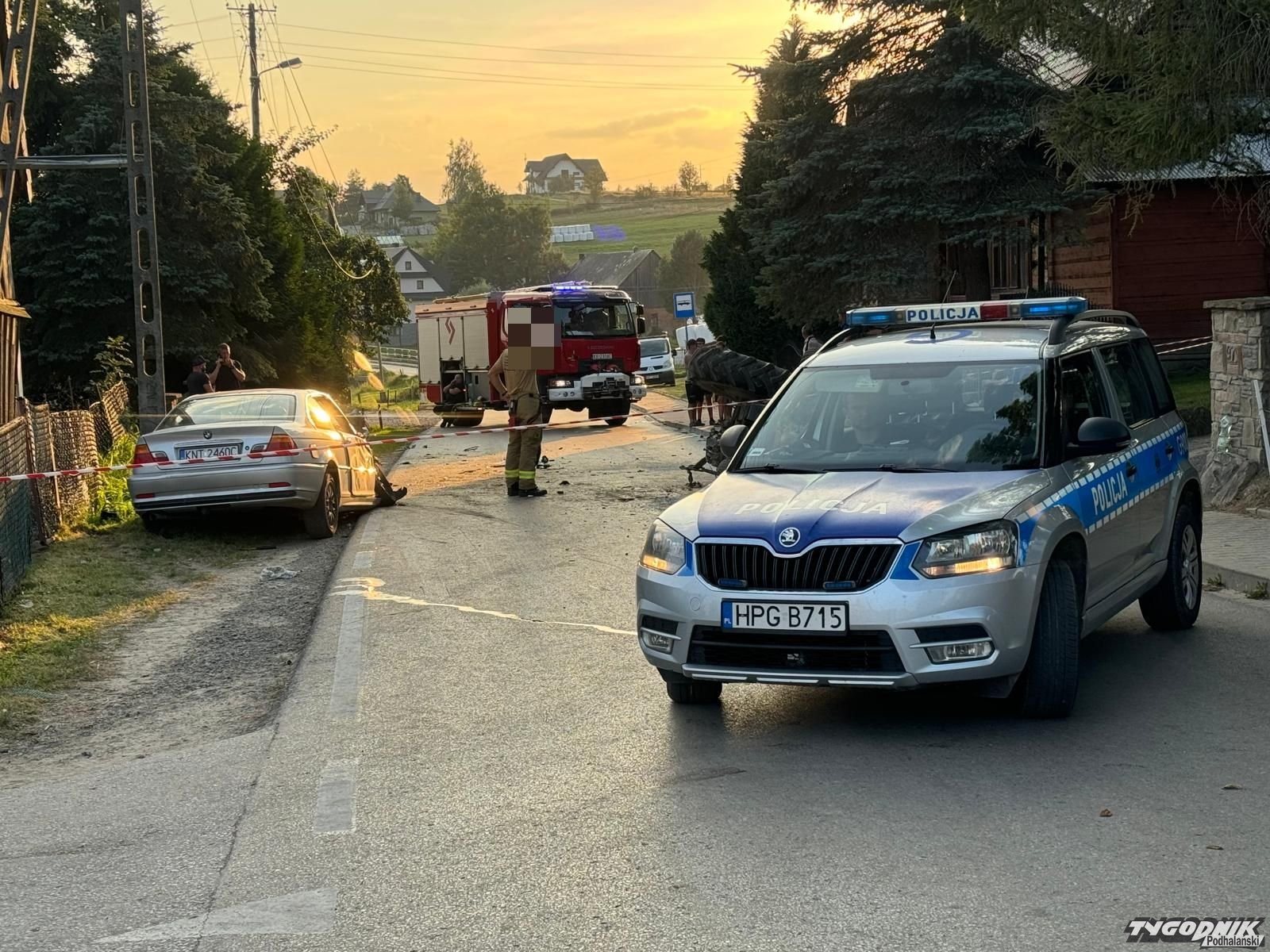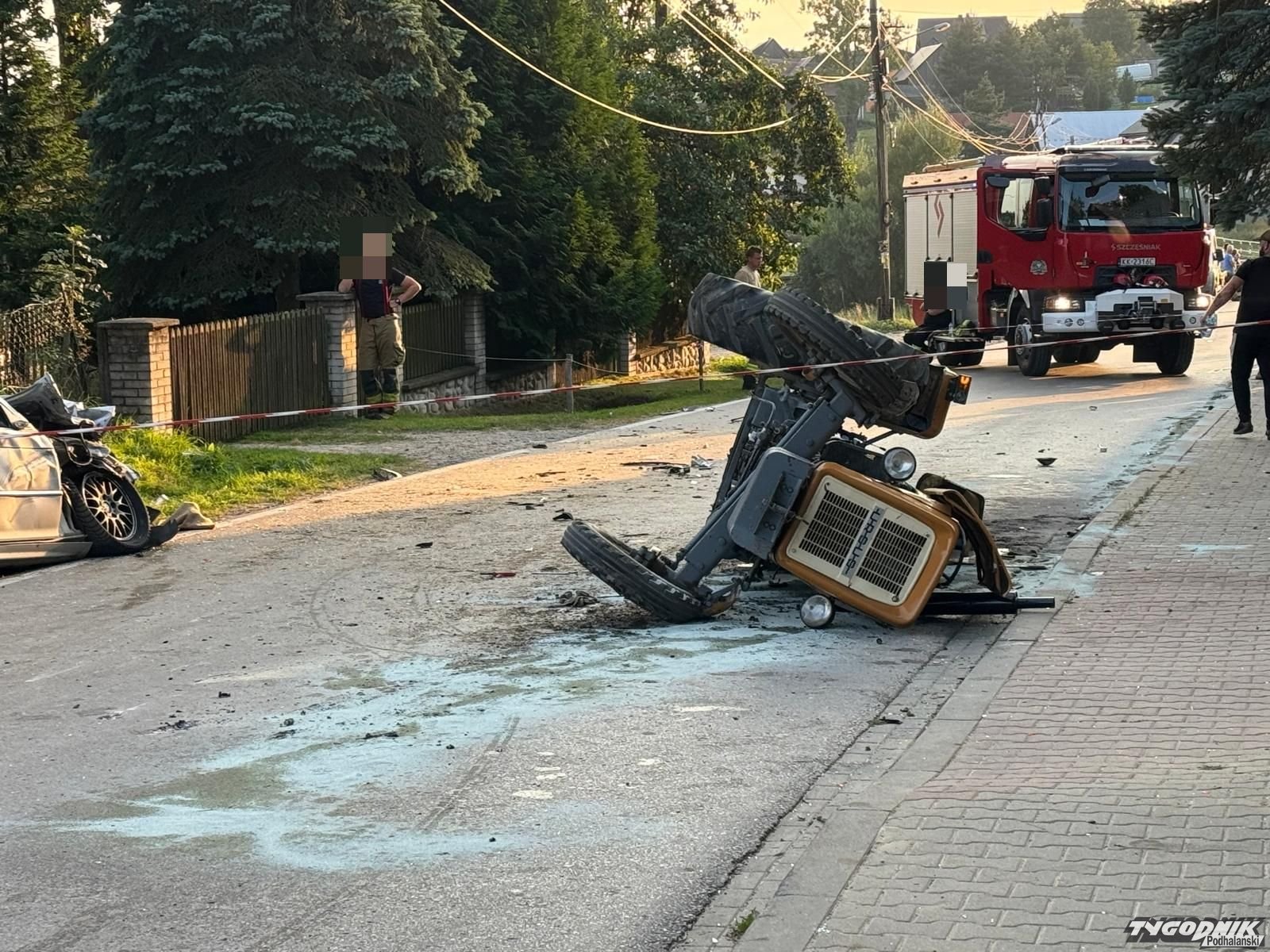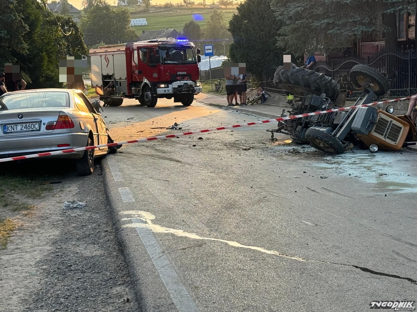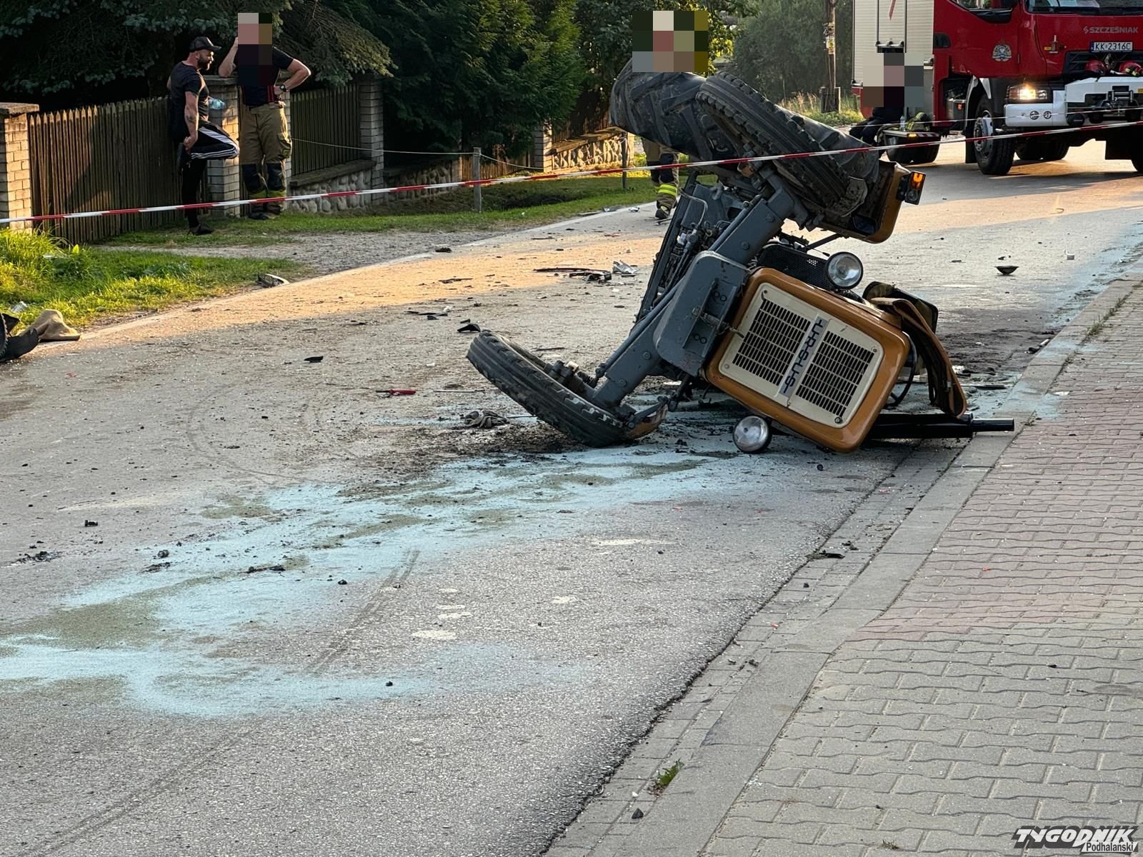 Wypadek zdarzył się w centrum wioski, przed osiemnastą. Na głównej drodze zderzyły się ciągnik i osobówka. Maszyna rolnicza wywróciła się. Obydwa pojazdy są bardzo mocno uszkodzone. W wypadku ucierpiały dwie osoby. Zostały zabrane do szpitala. Na miejscu pracują policjanci i strażacy. Droga jest całkowicie zablokowana.