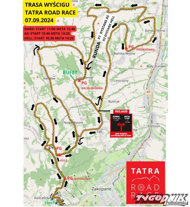 W związku z przejazdem wyścigu Tatra Road Race szosami Podhala na trasie przejazdu zawodników będą występowały czasowe utrudnienia w związku z pierwszeństwem przejazdu kolarzy, a niektóre odcinki zjazdowe i wąskie drogi będą na ten czas wyłączone z ruch.