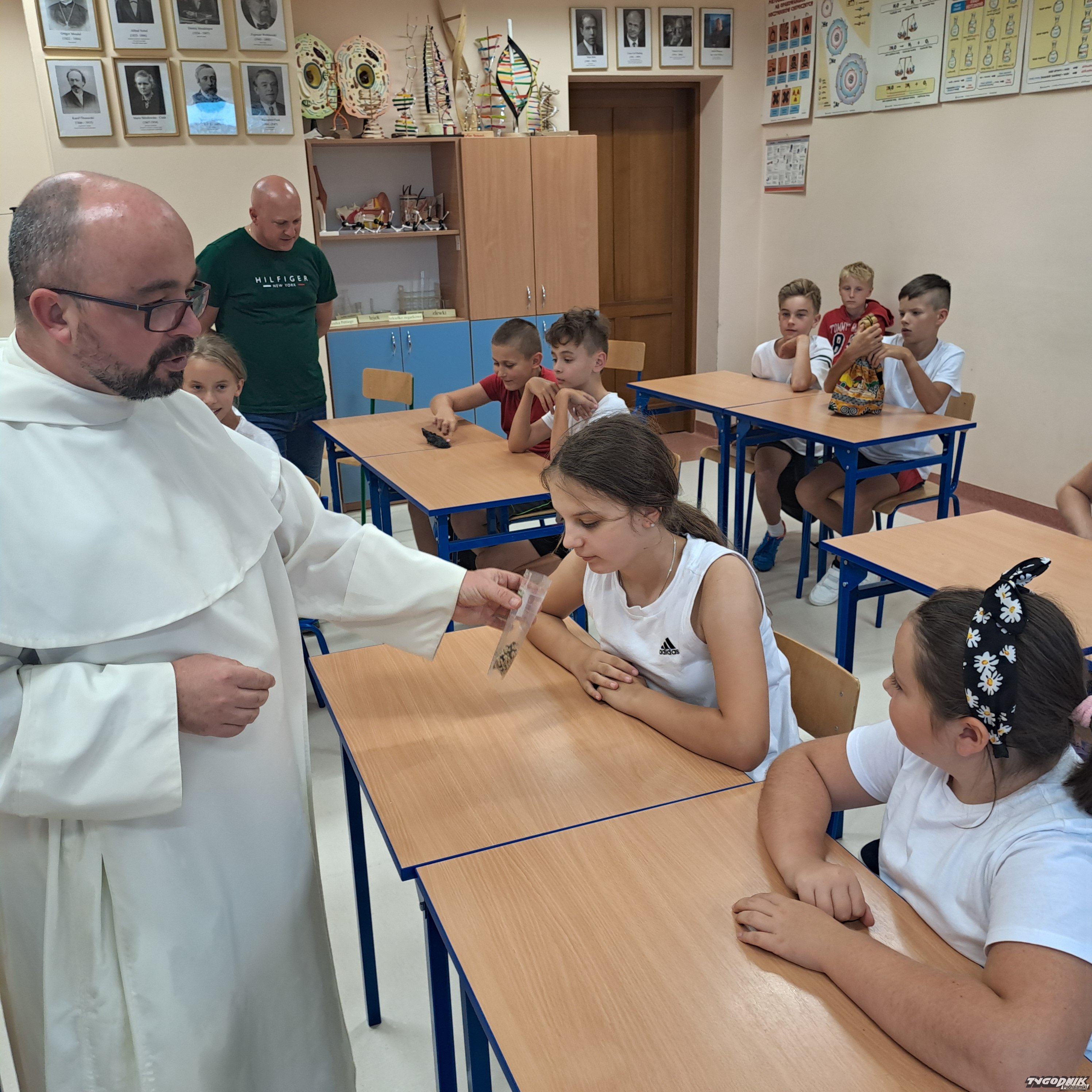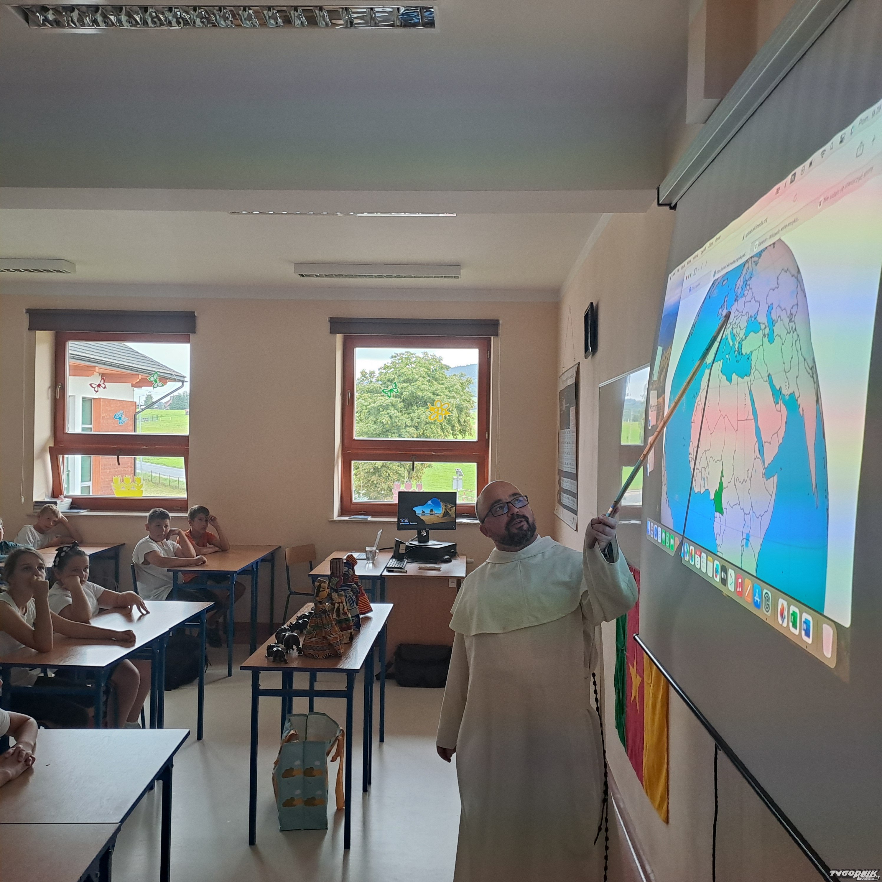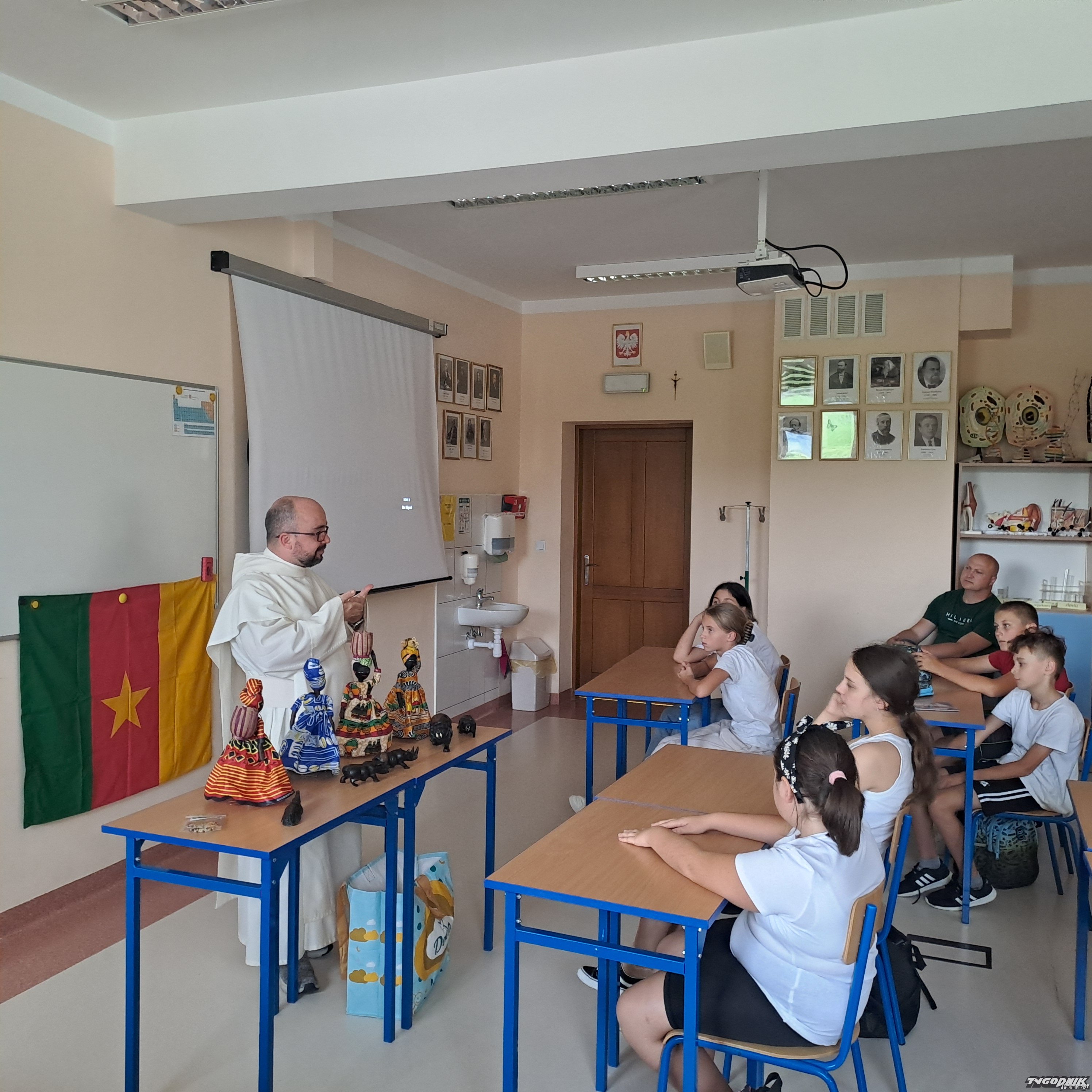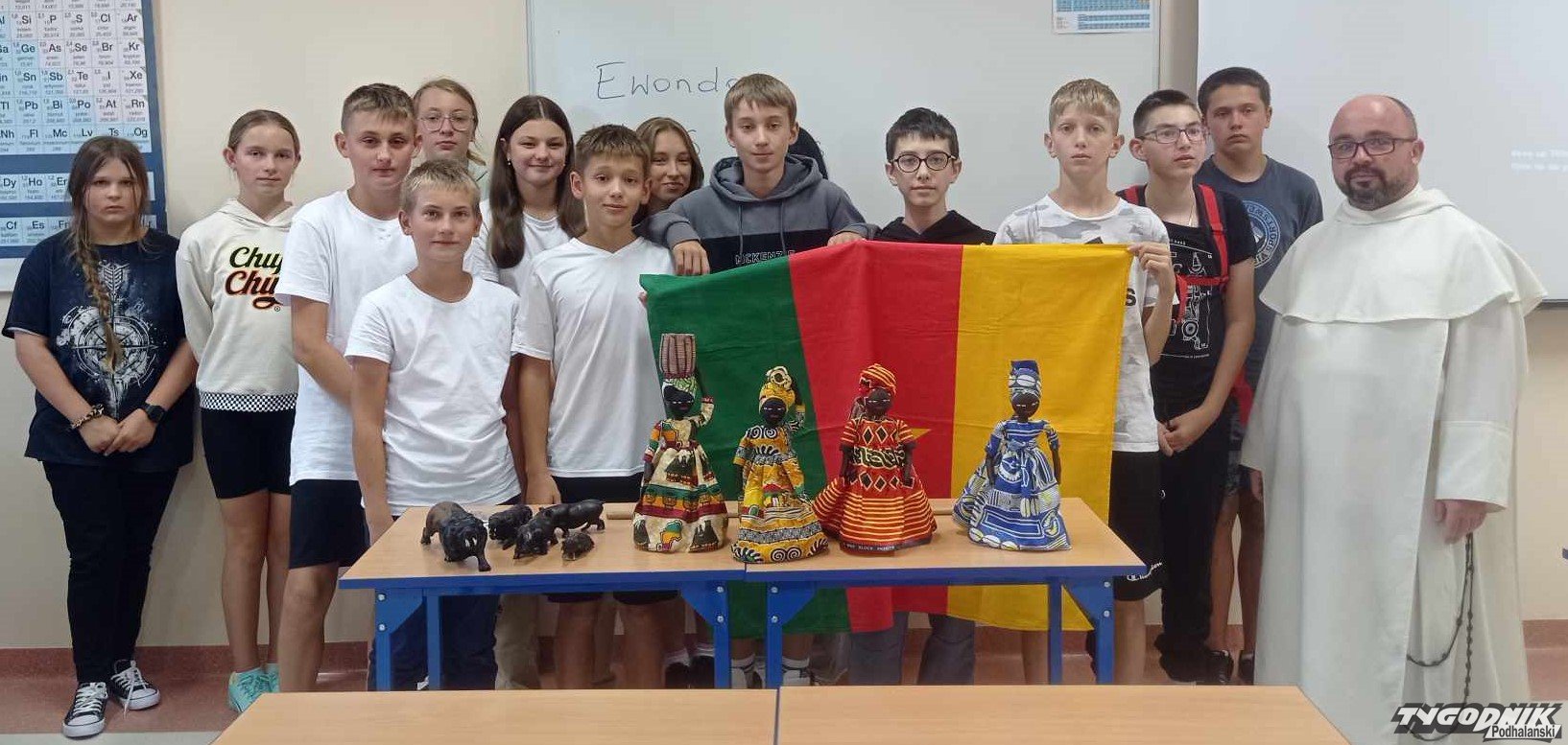 Duchowny przedstawił dzieciom historię i geografię Kamerunu pokazując i objaśniając flagę tamtego kraju, a także jako ciekawostkę powiedział, co robi w wolnym czasie. - Kamerun ma najwyższy szczyt na wysokości ponad 4 tys. metrów nad poziomem morza i jest to czynny krater wulkanu. Można tam na szczycie do niego zajrzeć, nie ma żadnych zabezpieczeń, robi to naprawdę wrażenie na człowieku - podkreślał o. Wojciech Jeziorski.