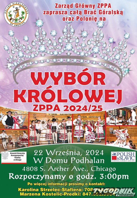 Dziewczyny startujące na Królową dodatkowo będą musiały się wykazać umiejętnością wiązania kierpców, wiązaniem gorsetu. Fachowym nałożeniem góralskiego sola na plecy tzw. zarzuceniem go (letnim i zimowym. Będą też pytania gwarowe, zaplatanie góralskiego warkocza, a nawet dojenie sztucznej krowy, cerowanie skarpetek czy robienie moskoli Szersze informacje na stronie Związku Podhalan Północnej Ameryki lub bezpośrednio u wiceprezes d/s kultury – Karoliny Strzelec-Stafiera (tel 708-745-4362)W niedzielę 22 września w Chicago Wybory Królowej ZPPA na lata 2024/25. Już czekają na zgłoszenia kandydatek.