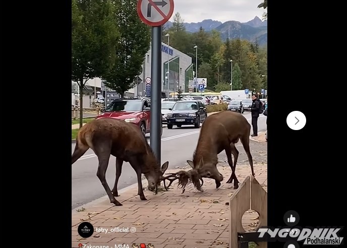 Cały czas trwa rykowisko. W Tatrach słychać porykiwania jeleni, które walczą o partnerki. W Zakopanem od kilku lat wzrasta populacja jeleni, więc walki byków przeniosły się także blisko samego centrum miasta. Na nagraniu z profilu "tatry_official" widać jak dwa byki walczą na ul. Jagiellońskiej wstrzymując ruch samochodów.