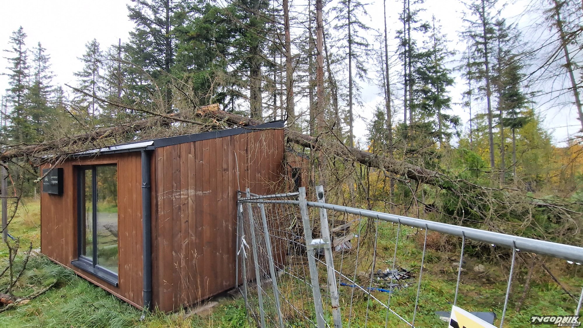 Halny powalił drzewo na domek kontenerowy obok słynnego w Zakopanem Sky Towera na Drodze do Białego.