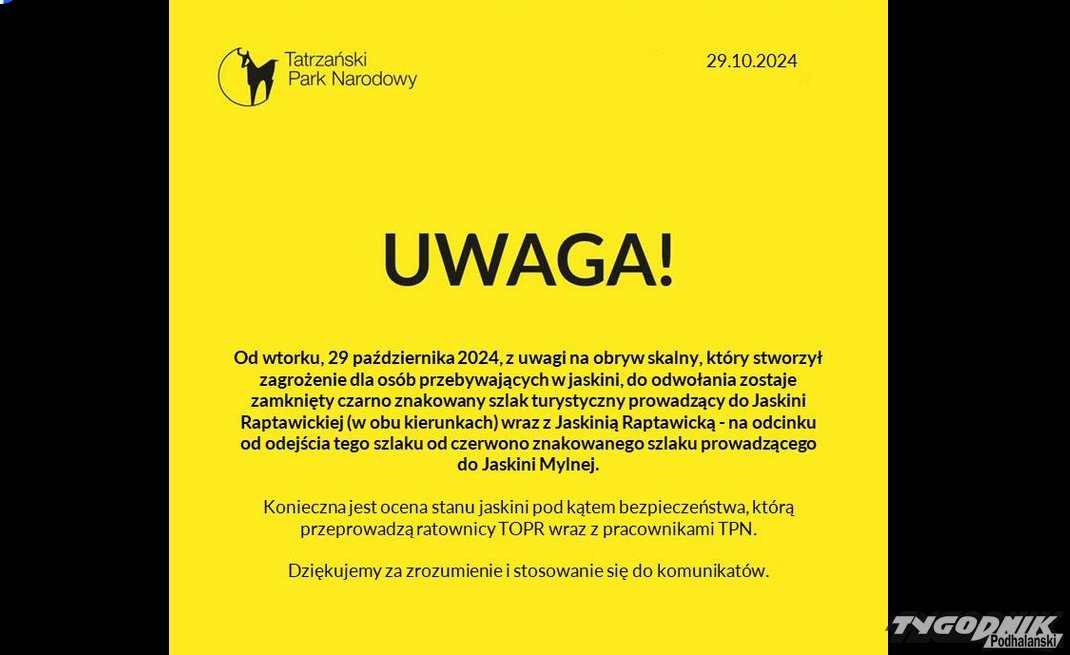 "Od wtorku, 29 października 2024, z uwagi na obryw skalny, który stworzył zagrożenie dla osób przebywających w jaskini, do odwołania zostaje zamknięty czarno znakowany szlak turystyczny prowadzący do Jaskini Raptawickiej (w obu kierunkach) wraz z Jaskinią Raptawicką - na odcinku od odejścia tego szlaku od czerwono znakowanego szlaku prowadzącego do Jaskini Mylnej" - czytamy w komunikacie TPN.